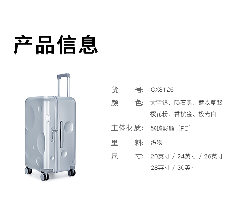貨號(hào): CX8126-28 主體面料:聚碳酸酯(PC);里料:織物 28寸顏色:時(shí)空銀 凈重: 4.30kg/93L
