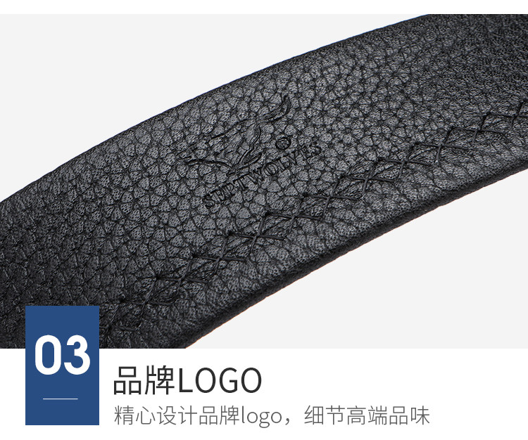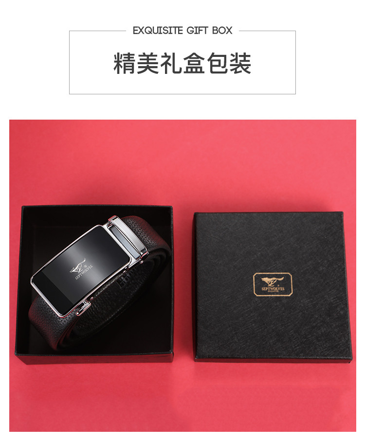 工藝:光面 帶扣款式:自動扣 主體材質(zhì):頭層牛皮 帶扣材質(zhì):合金 風(fēng)格:通勤風(fēng) 商務(wù)風(fēng) 寬度:3.5CM 送愛人,送長輩,送男士 時尚設(shè)計扣頭,經(jīng)典個性,簡約百搭,磨砂背扣,材質(zhì)柔軟,手感舒適,經(jīng)典狼標LOGO 代寫賀卡,傳遞心聲,精美禮盒,送禮佳品