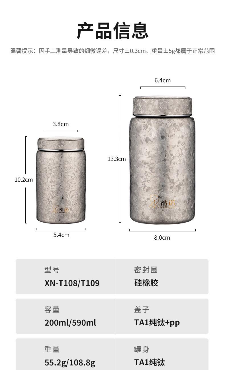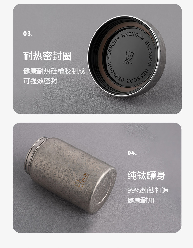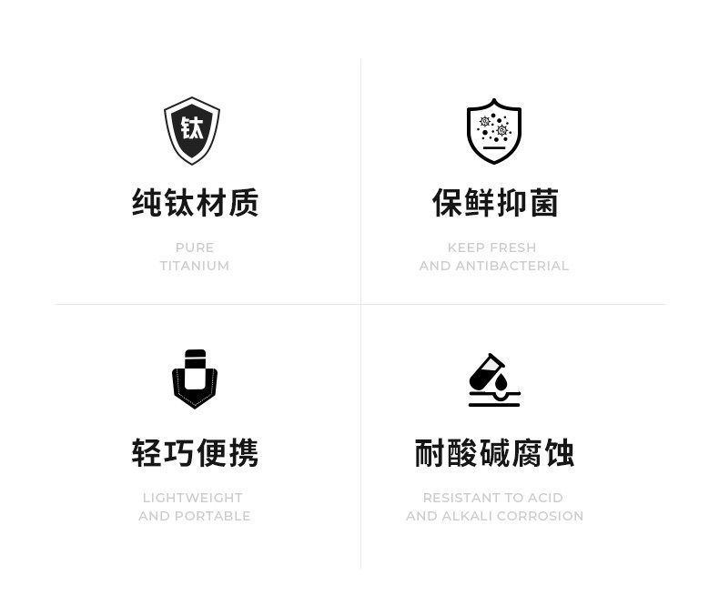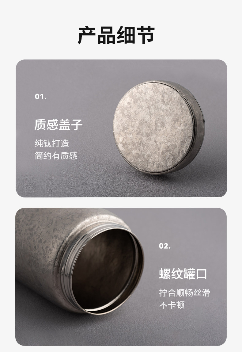 材質(zhì):鈦 顏色:銀月白/遠(yuǎn)天藍(lán)/煙墨灰 附加組件:無附件組件 密封圈:硅橡膠 容量:200ml/590ml 外箱尺寸:62*49*24 cm 毛凈重:8.5/2.1 鈦金屬打造,健康安全 保溫保冷,耐高低溫 耐酸堿腐蝕 無噴漆,不易掉色