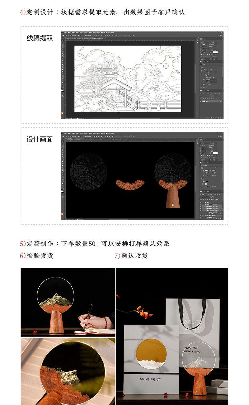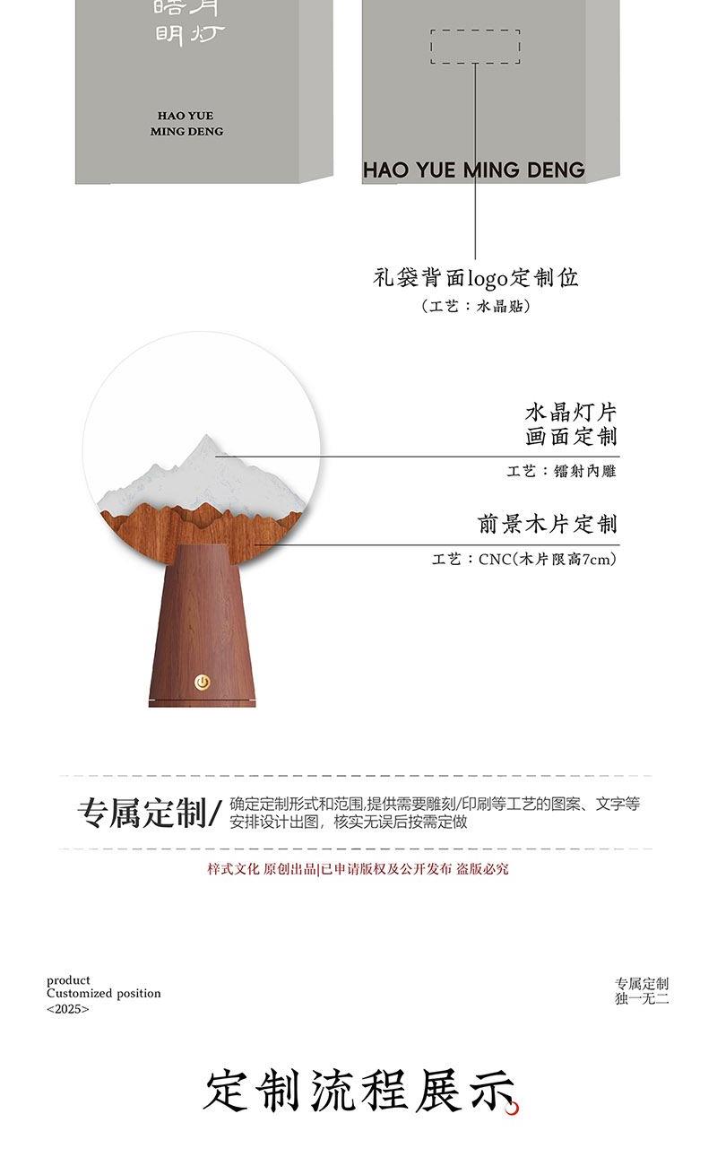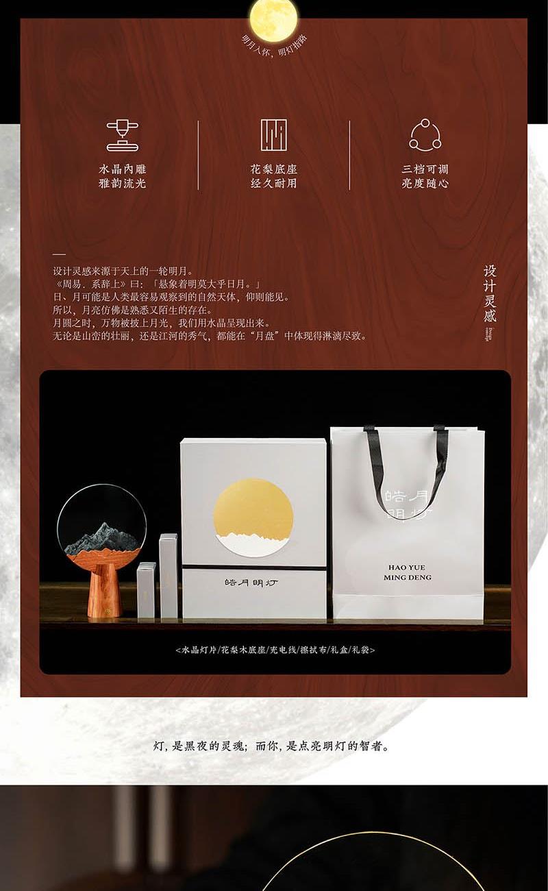 產(chǎn)品材質(zhì):花梨木、水晶片 禮盒尺寸:25*10*32 cm 禮盒重量:1.4kg 底座0.45*1.05*cm 水晶片1.7*0.08cm 產(chǎn)品標(biāo)配:木質(zhì)燈座、木質(zhì)裝飾片、水晶燈片、禮盒、禮袋 定制位:擺件底座、燈片圖案、禮袋 送禮場景:恩師贈(zèng)禮、紀(jì)念禮、喬遷禮、會(huì)議伴手禮、高校禮物 送禮寓意:念伯樂故人,千里至此明月