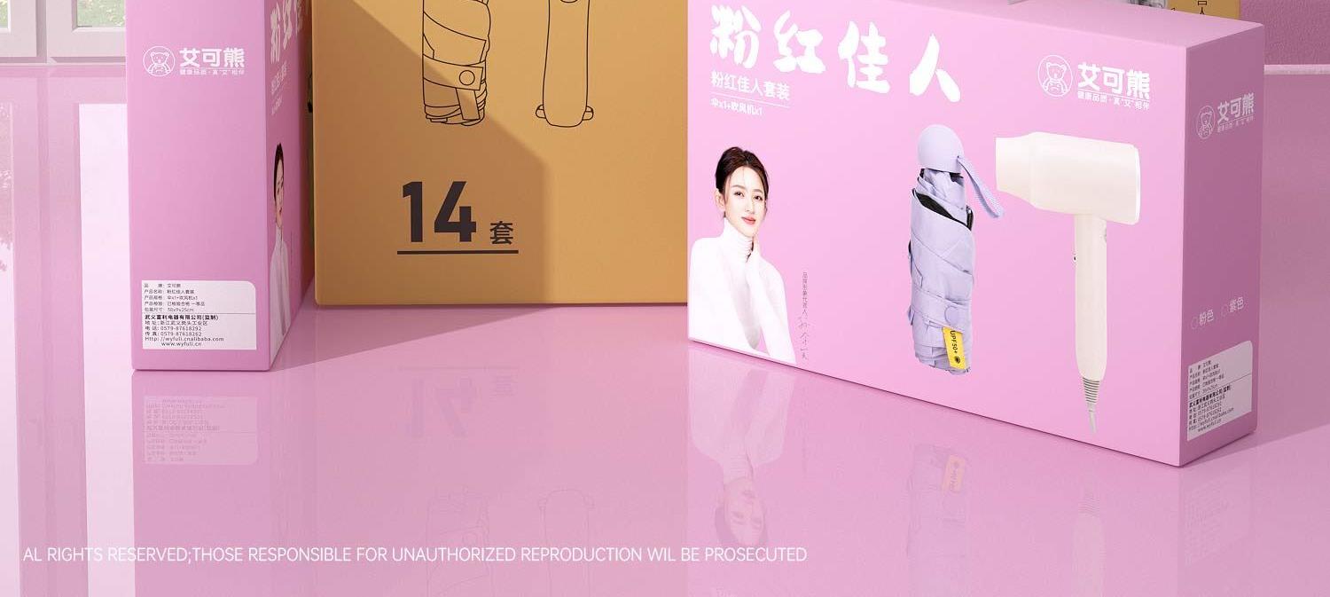 品 牌:艾可熊 產(chǎn)品:粉紅佳人套裝 產(chǎn)品:傘x1+吹風(fēng)機(jī)x1 產(chǎn)品檢驗(yàn):已檢驗(yàn)合格 一等品 包裝尺寸:38x9x25cm 外箱尺寸:68x39x52cm