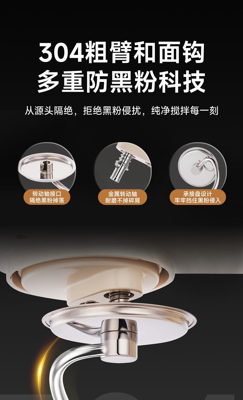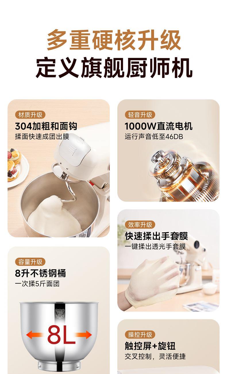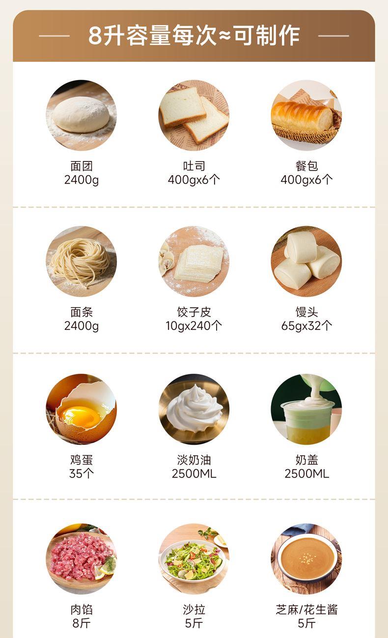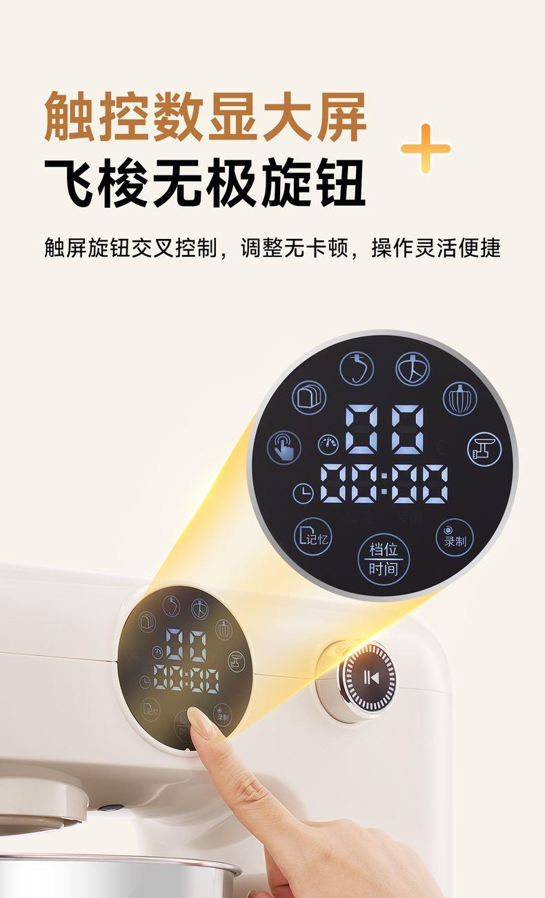 1500w大功率電機(jī),大功率和面快 打發(fā)快; 8升容量家商兩用,可和5斤面團(tuán),打發(fā)2500ml奶油,30個雞蛋; 3大配件,6檔位隨心操作,可視化防濺蓋中途加料不費(fèi)勁; 一鍵抬頭設(shè)計,抬頭即斷電,加固吸盤底座,防滑防晃動; 定時恒溫發(fā)酵功能,面溫控制25-38度發(fā)酵實現(xiàn)和面醒面一體;