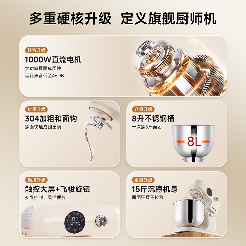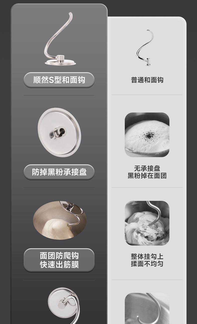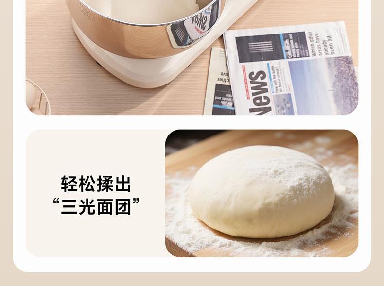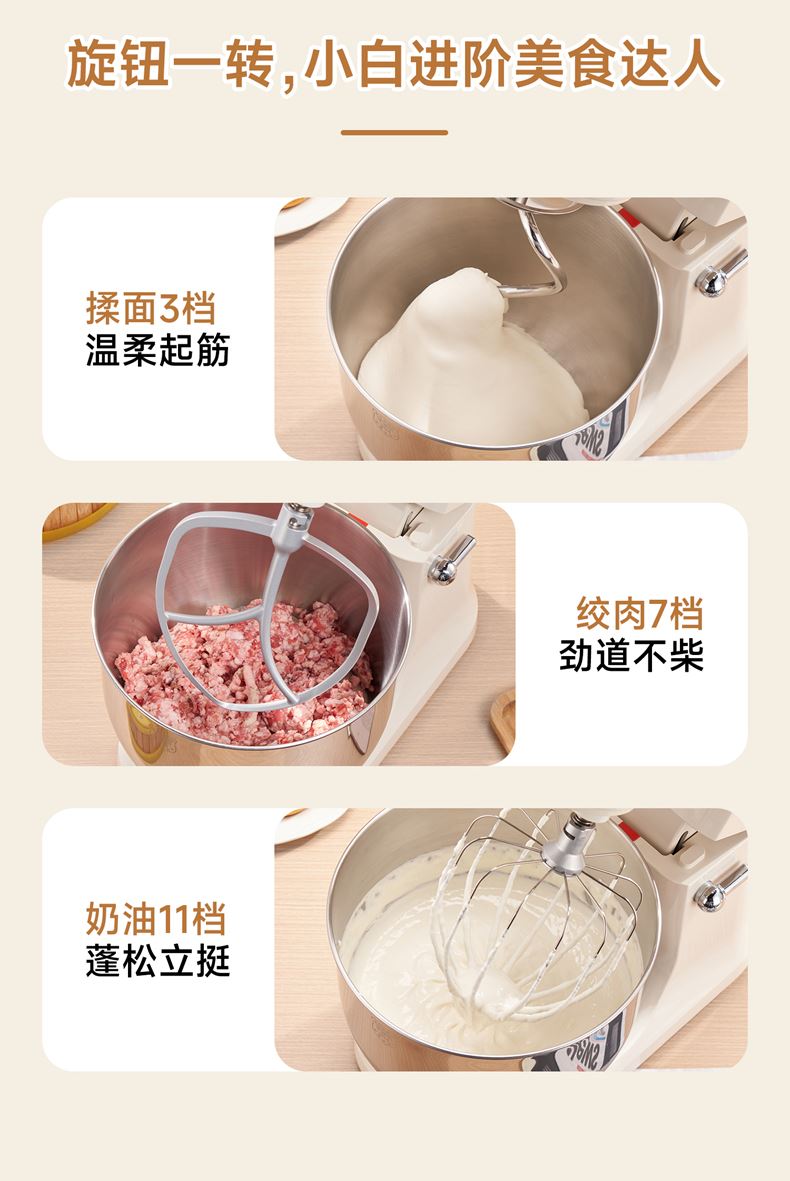 1500w大功率電機(jī),大功率和面快 打發(fā)快; 8升容量家商兩用,可和5斤面團(tuán),打發(fā)2500ml奶油,30個雞蛋; 3大配件,6檔位隨心操作,可視化防濺蓋中途加料不費(fèi)勁; 一鍵抬頭設(shè)計,抬頭即斷電,加固吸盤底座,防滑防晃動; 定時恒溫發(fā)酵功能,面溫控制25-38度發(fā)酵實現(xiàn)和面醒面一體;