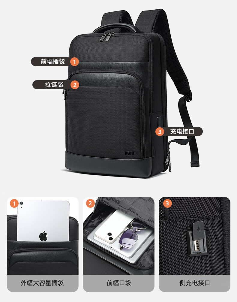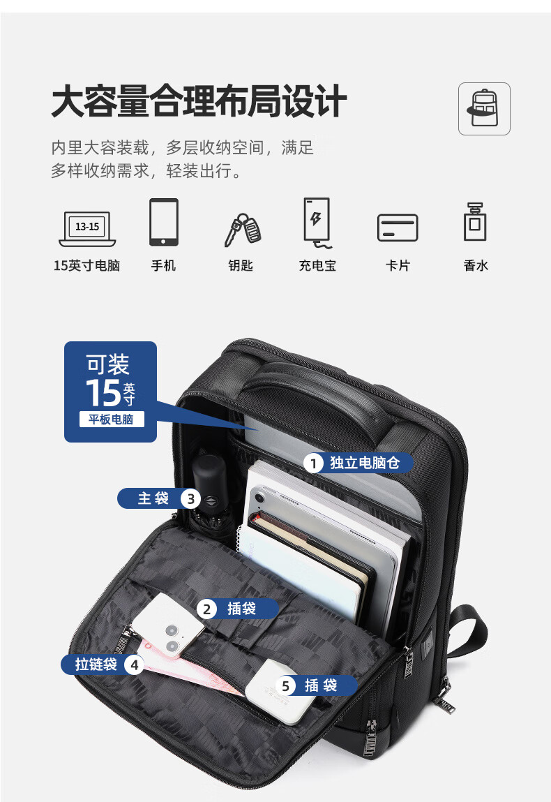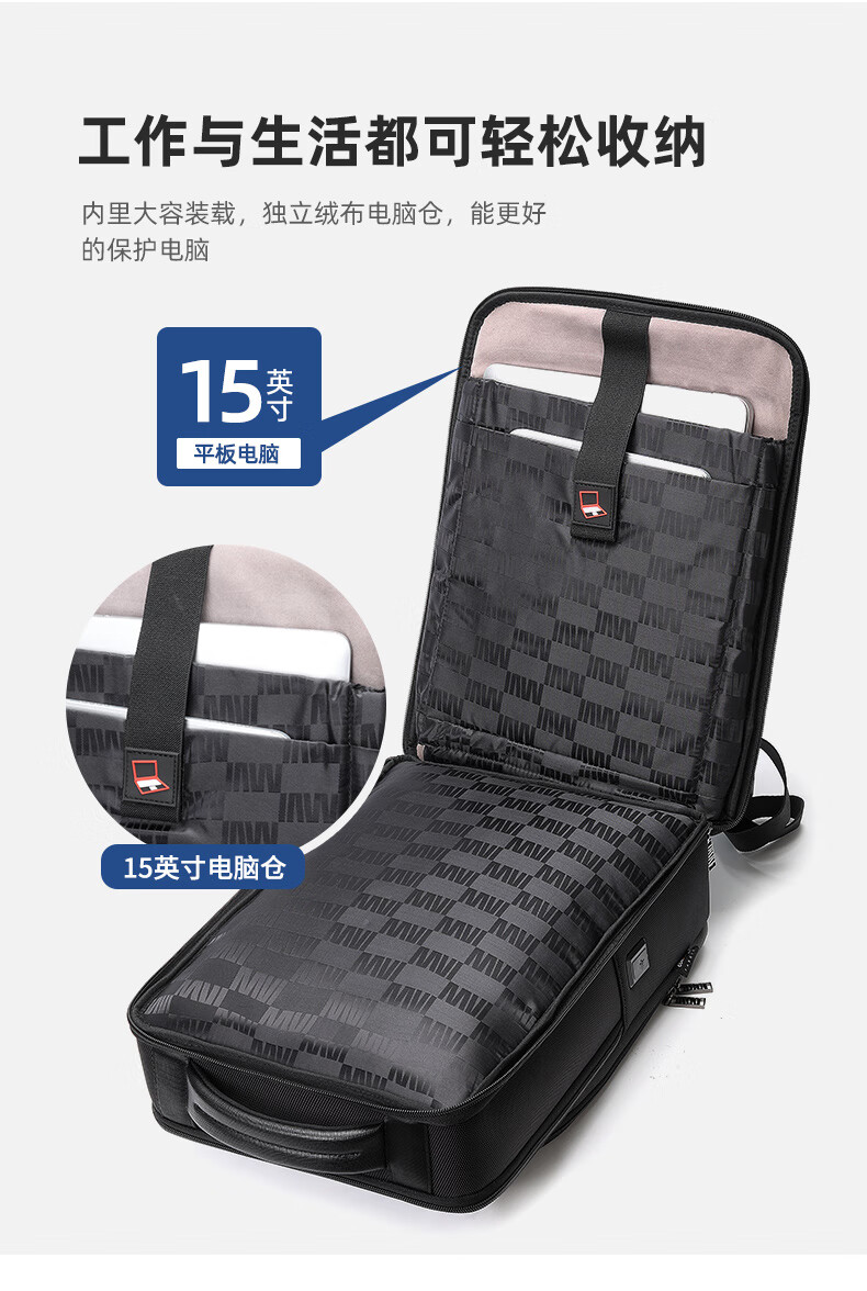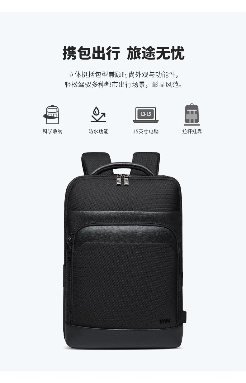 類別:背包 外部材質(zhì):織物 閉合方式:翻蓋式 規(guī)格:300x140x430mm 容納電腦尺寸:15英寸 風(fēng)格:通勤風(fēng) 商務(wù)風(fēng) 攜包出行,旅途無憂,立體挺括包型兼顧時(shí)尚外觀與功能性,輕松駕馭多種都市出行場(chǎng)景 內(nèi)里大容裝載,多層收納空間,滿足多樣收納需求,輕裝出行,采用高密度織物面料,防刮耐用,防潑賤,輕松應(yīng)對(duì)潑水