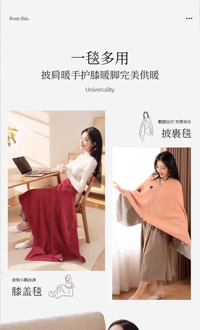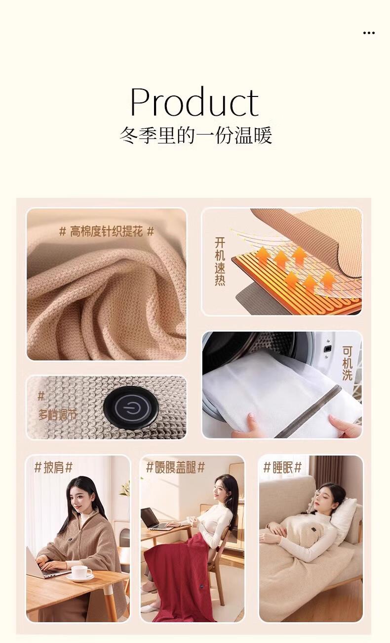 型 號:WP3 額定電壓:5V 額定功率:5W 凈 重:0.9公斤 毛 重:1.2公斤 產品尺寸:150*80cm 充電寶:10000毫安 高棉度針織提花,大尺寸云感暖絨 八區(qū)石墨烯片,快速加熱,多檔可調 溫度檔位50-55-60° 可拆卸水洗,無異味,不掉色 含一個10000mha充電寶