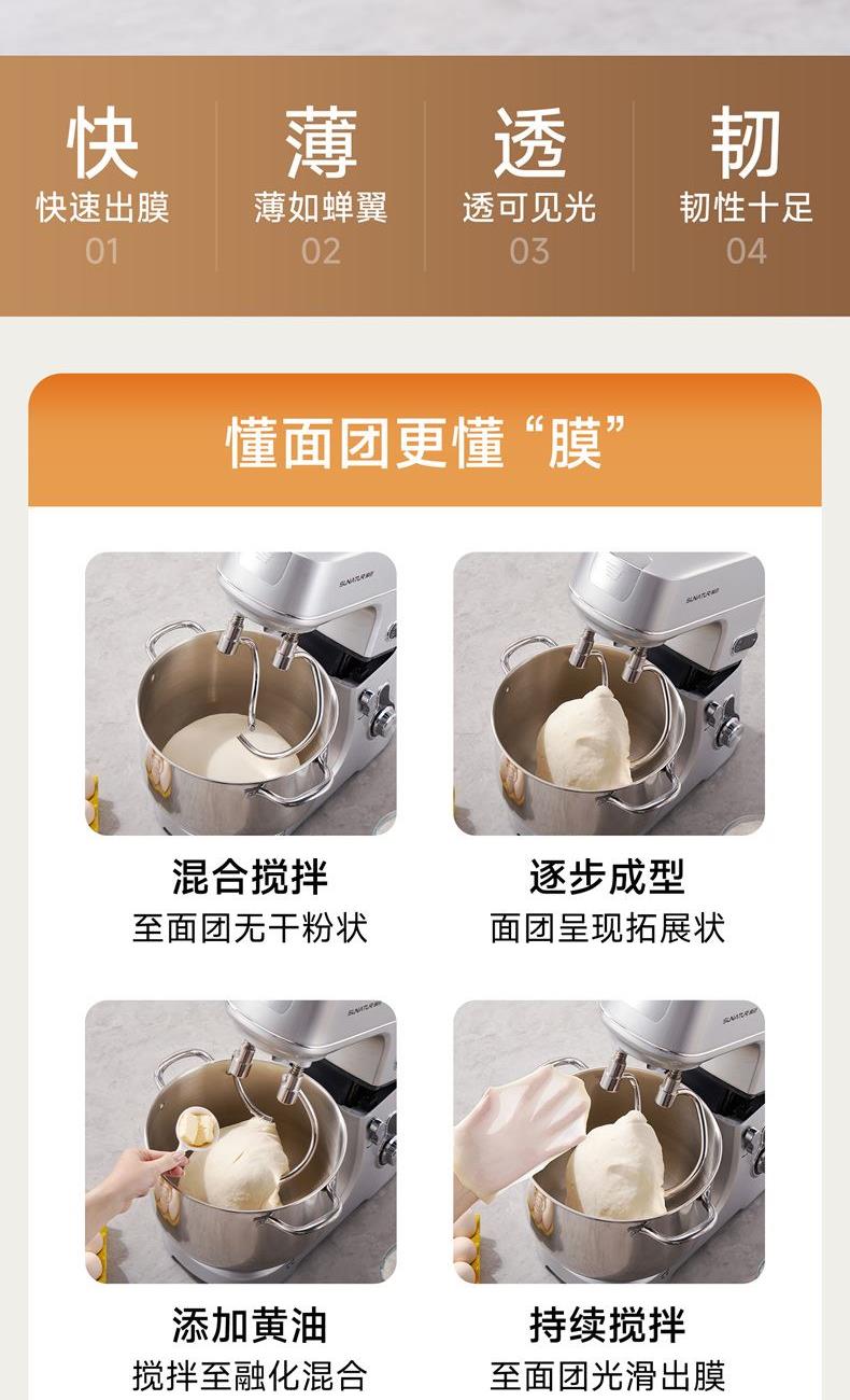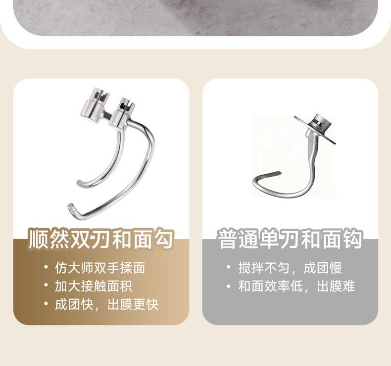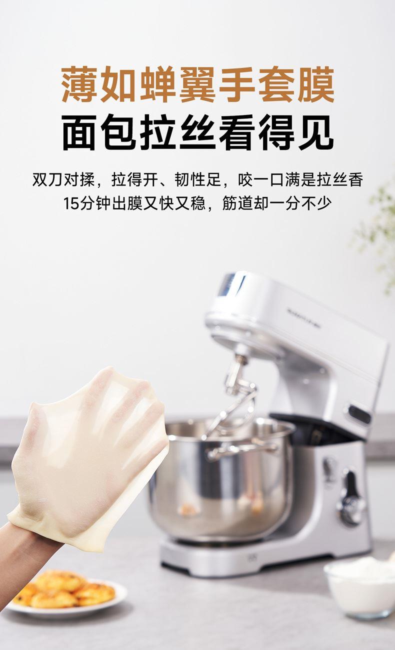 升級(jí)雙刀和面鉤,快速15分鐘出膜,面團(tuán)薄滑柔韌;