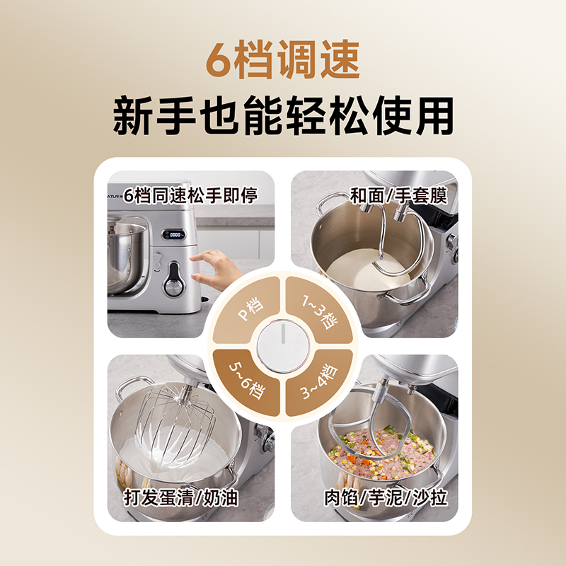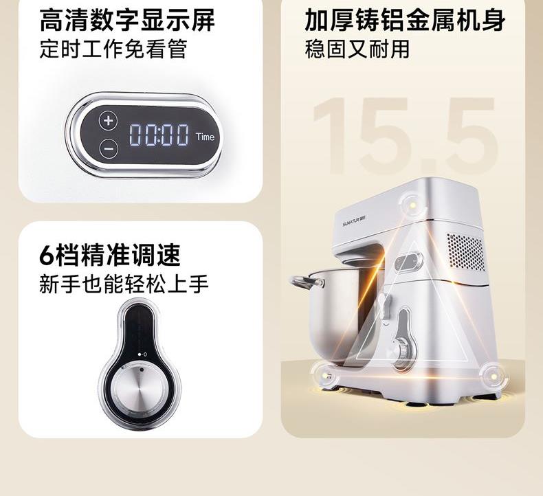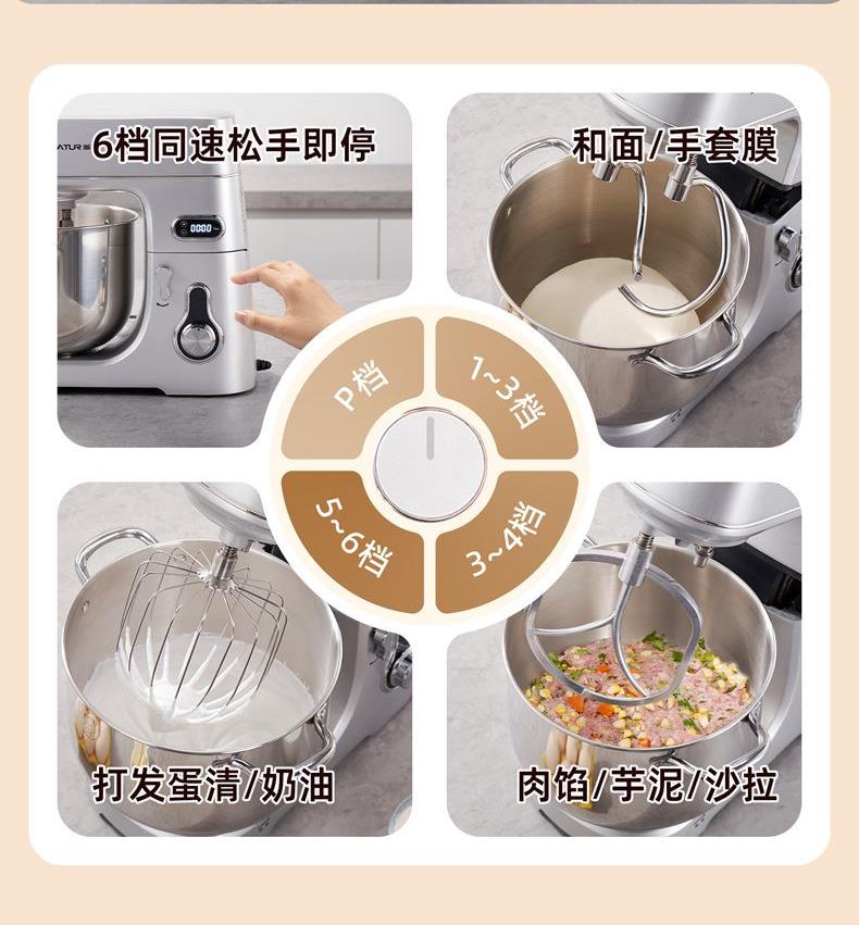 智能定時(shí)免看管,IC芯片控制,保證揉面運(yùn)行速度勻速穩(wěn)定;