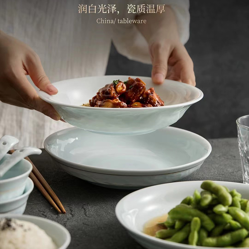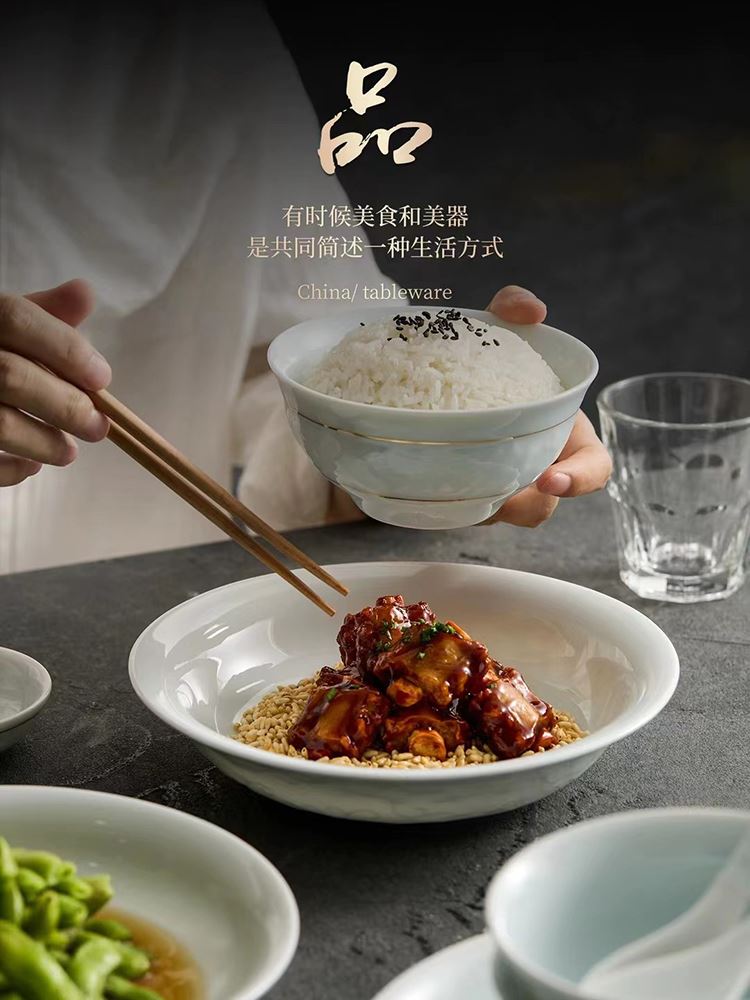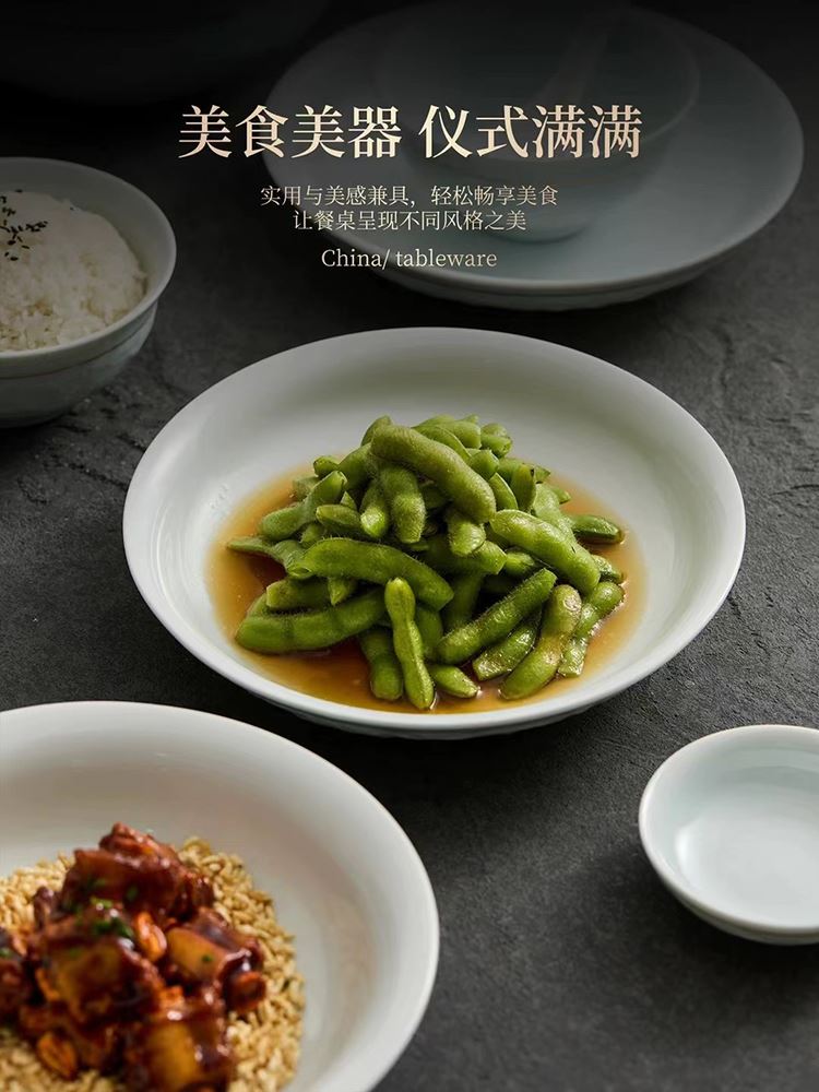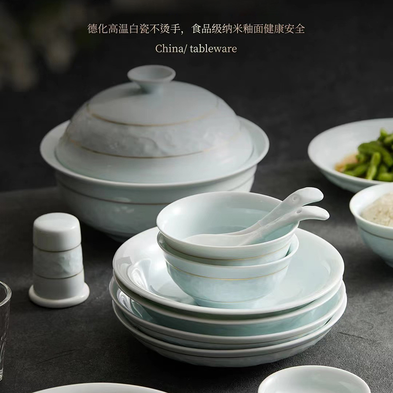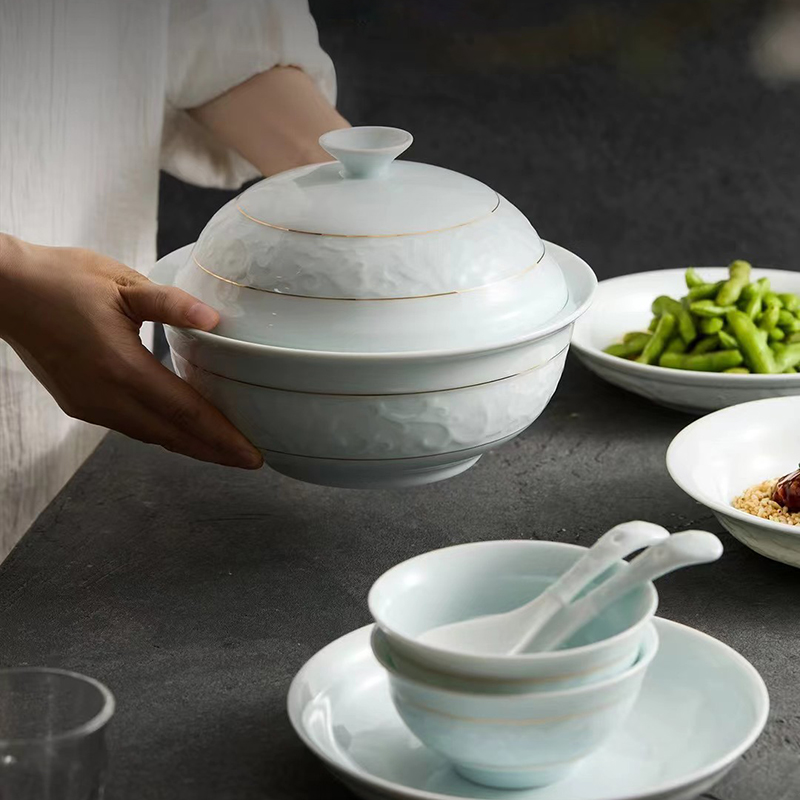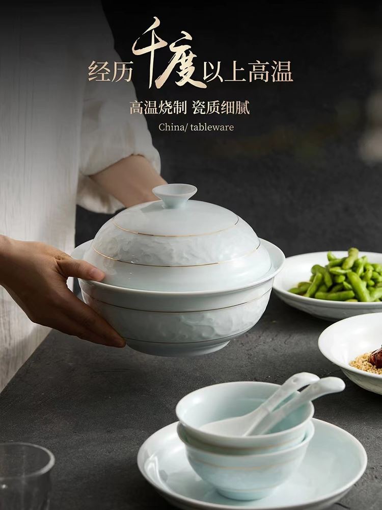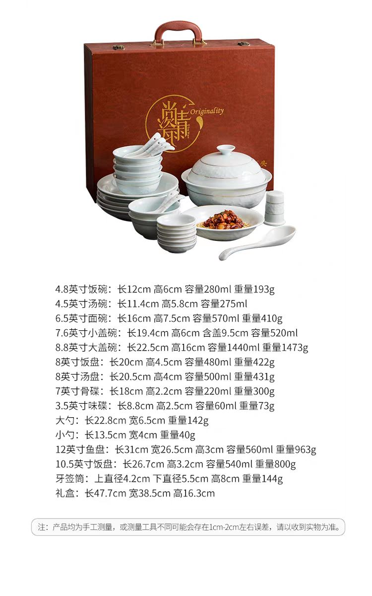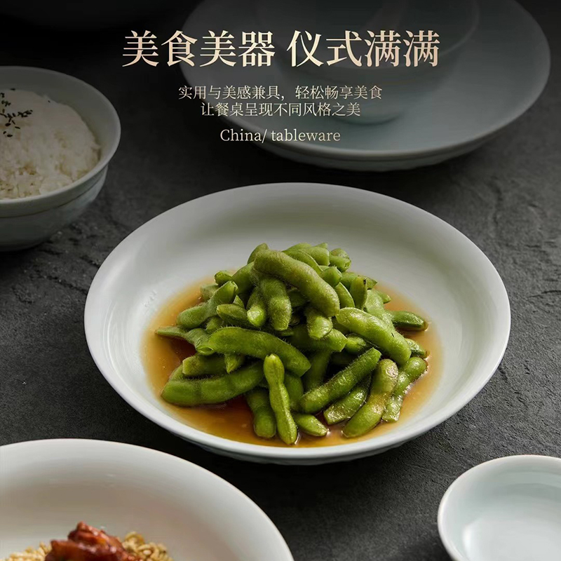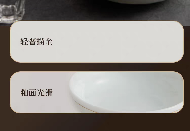 配置:8.8寸大蓋碗*1,8寸湯盤*3,牙簽筒*1,8寸飯盤*3,4.8寸飯碗*6,3.5寸味碟*6,小勺*6。