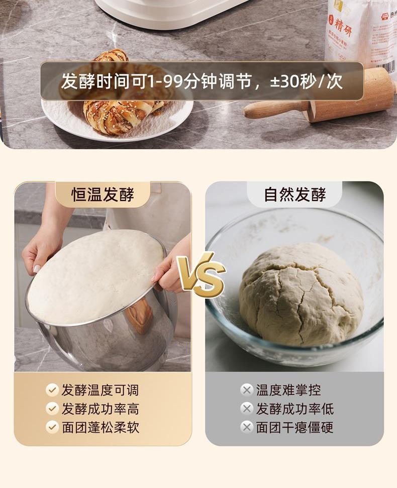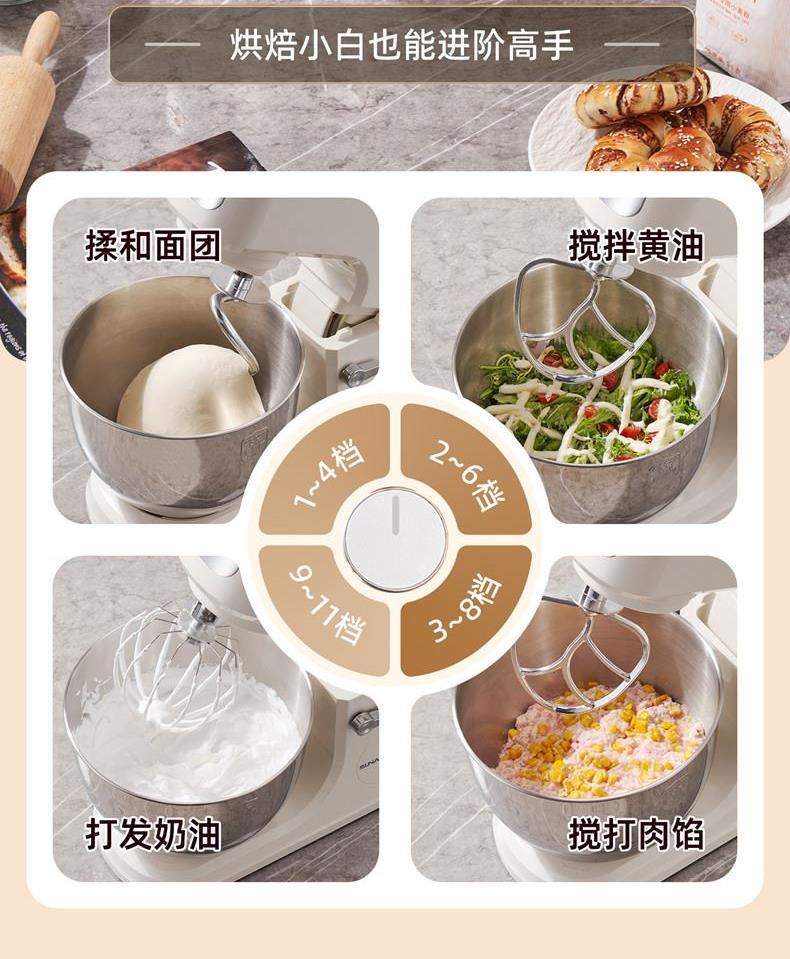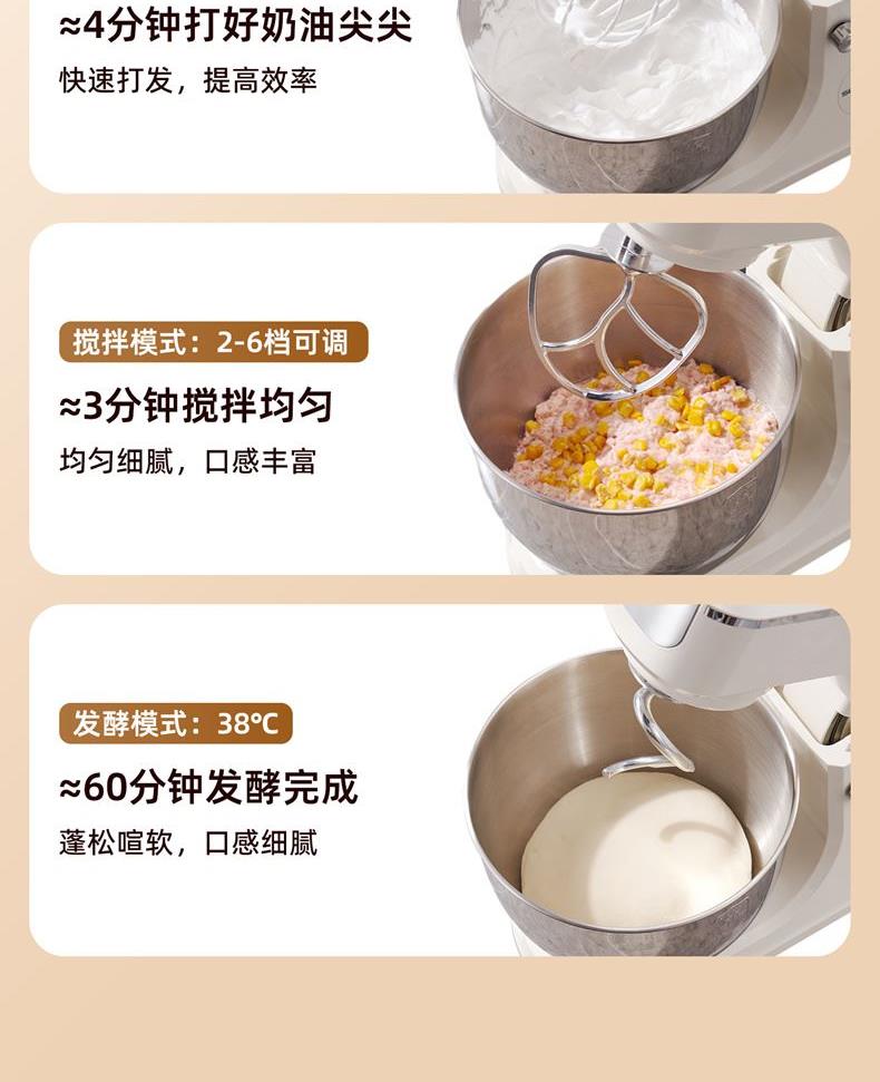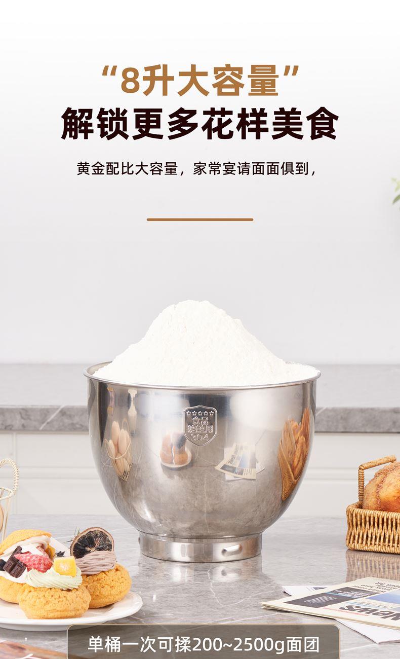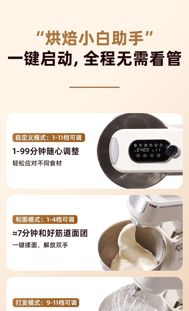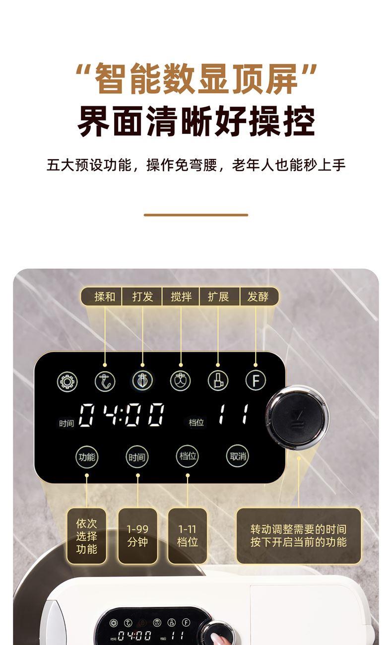 2000W大功率,動力足,快速揉好各種面團; 304 不銹鋼材質(zhì),模擬專業(yè)手法; 11 檔靈活調(diào)速,8L大容量,滿足多口之家或私房烘焙需求; 頂部觸控屏,定時恒溫發(fā)酵,揉面發(fā)酵一體化; 底部 6 個吸盤,揉面時穩(wěn)固機身,減少震動噪音; 可選配擴展配件,解鎖更多面條玩法;