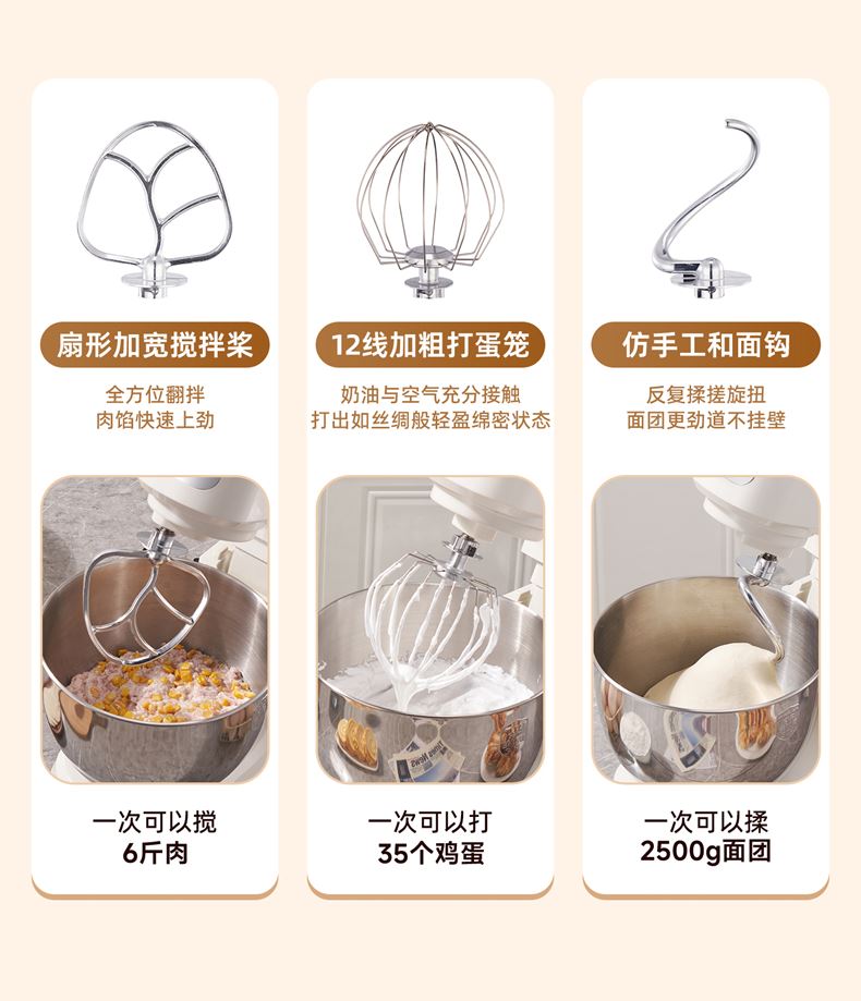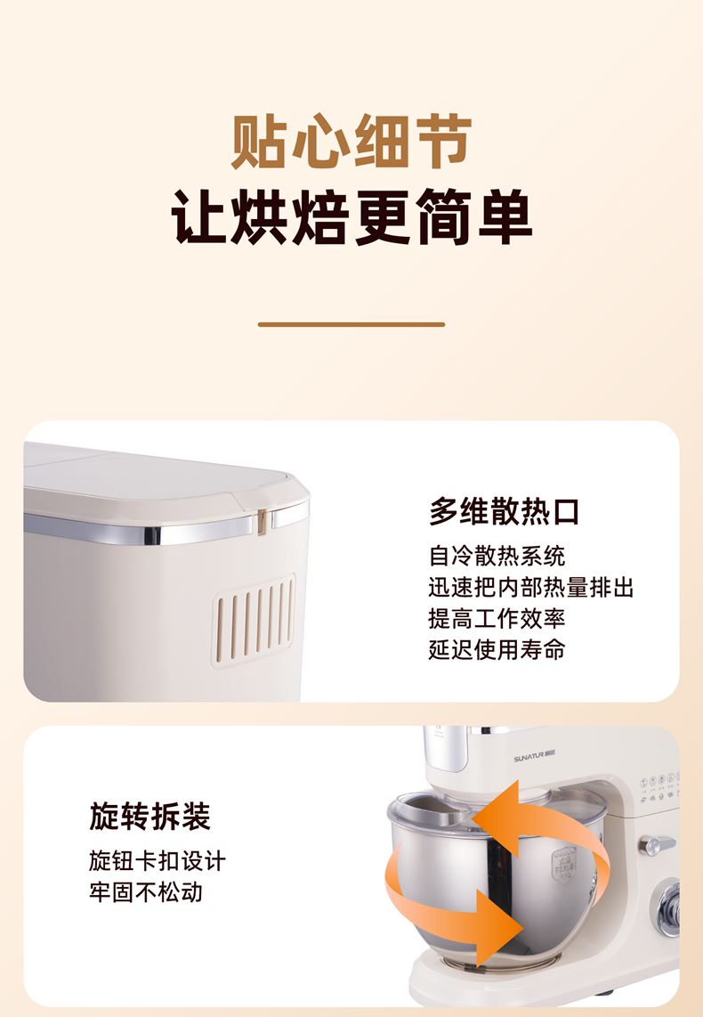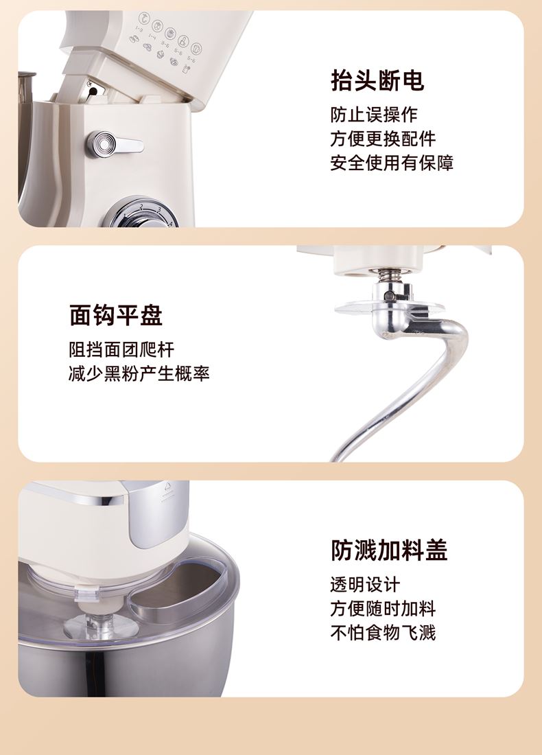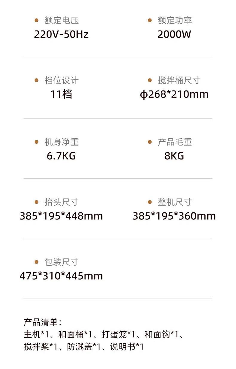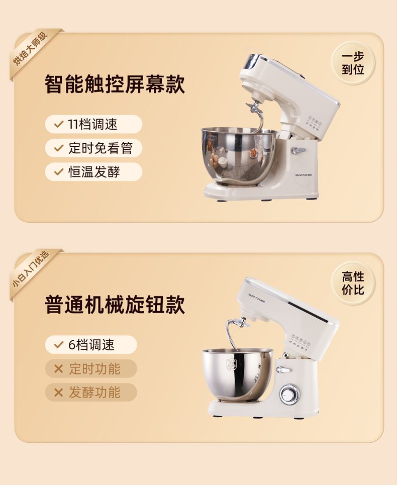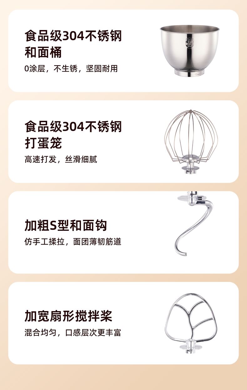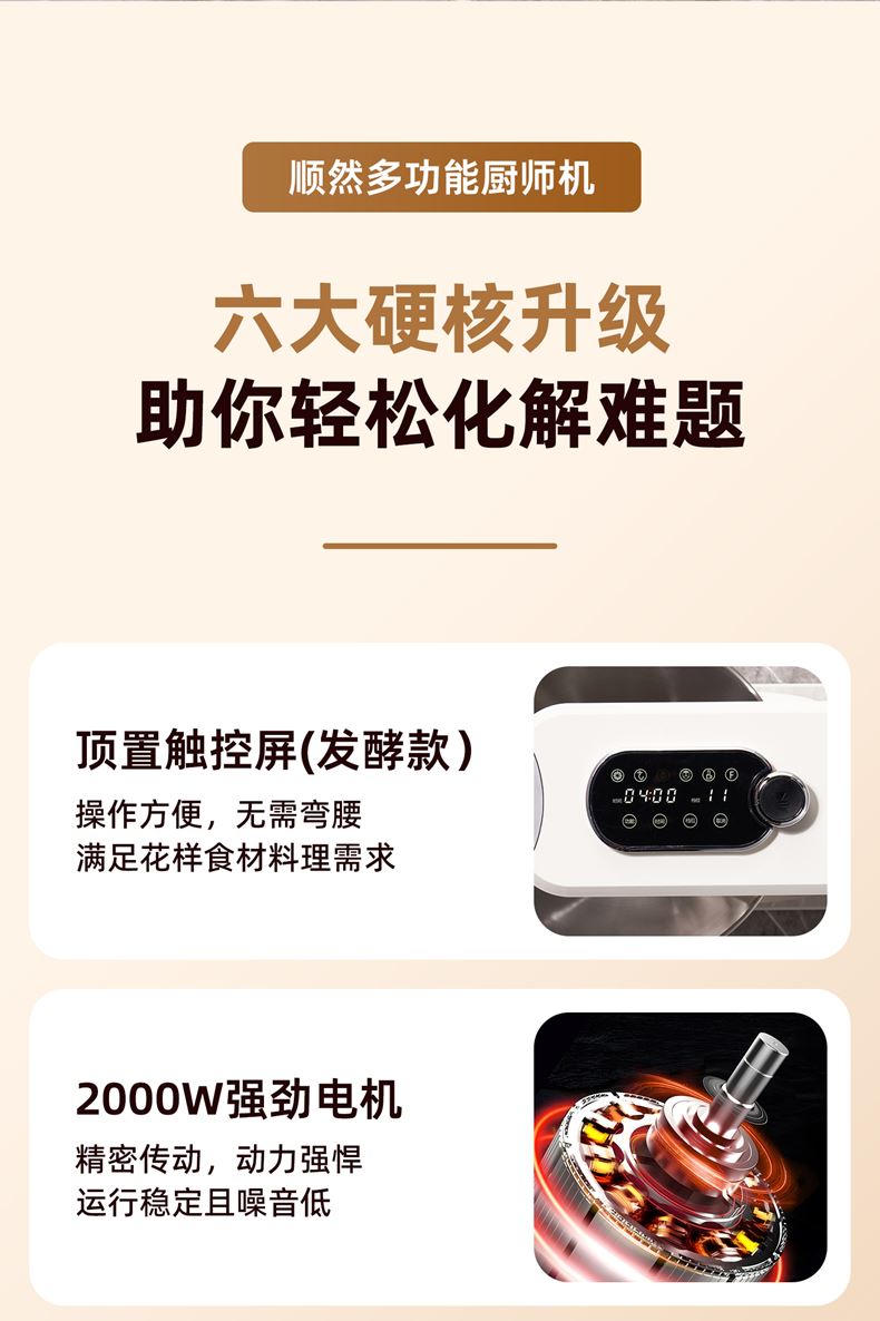 2000W大功率,動力足,快速揉好各種面團; 304 不銹鋼材質(zhì),模擬專業(yè)手法; 11 檔靈活調(diào)速,8L大容量,滿足多口之家或私房烘焙需求; 頂部觸控屏,定時恒溫發(fā)酵,揉面發(fā)酵一體化; 底部 6 個吸盤,揉面時穩(wěn)固機身,減少震動噪音; 可選配擴展配件,解鎖更多面條玩法;