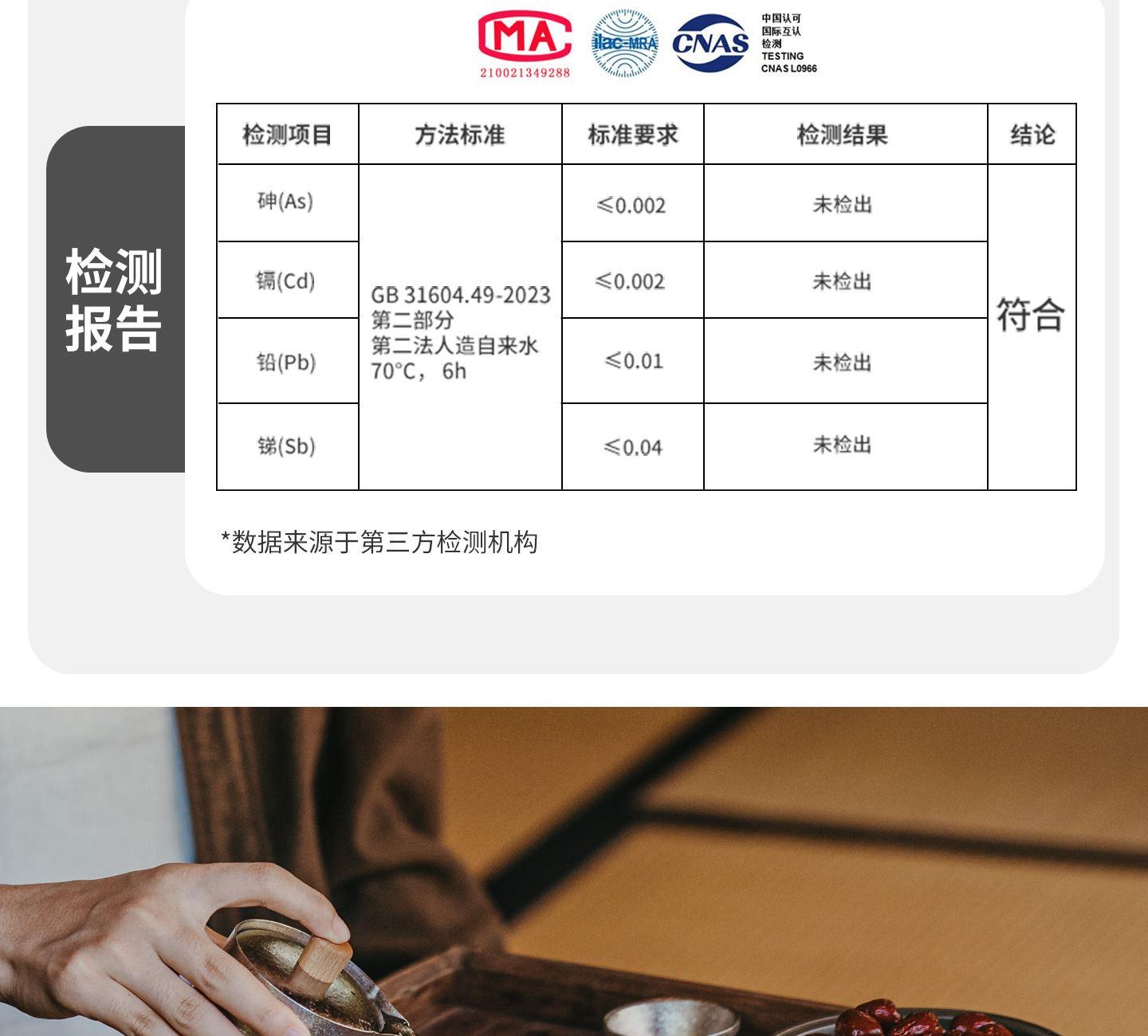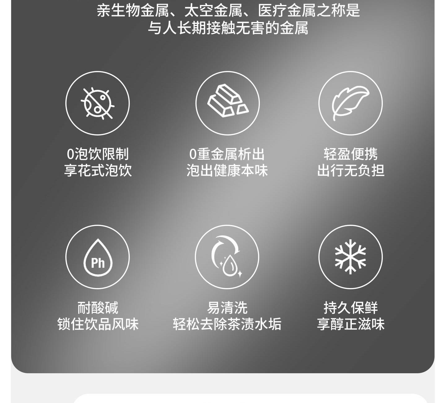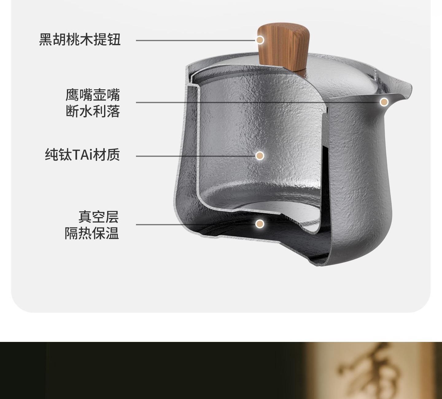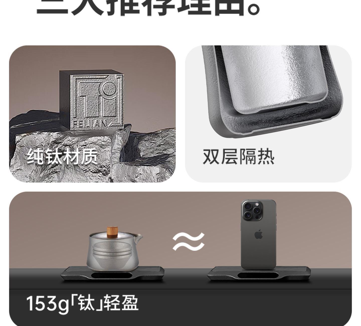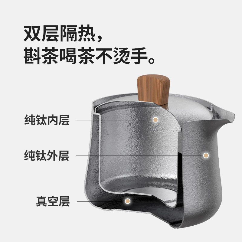 產(chǎn)品:CNK2450CF025 隨風(fēng)鈦茶具套裝 尺寸:8.7×8.55×8.4cm 重量:約153g 顏色:冰晶銀色 材質(zhì):純鈦TAi、黑胡桃木 容量:150ml(茶壺)40ml(茶杯) 產(chǎn)品特點: 「鈦」有心意,精致禮盒包裝 雙層隔熱,斟茶喝茶不燙手 內(nèi)外純鈦材質(zhì),還原醇正茶香 153g「鈦」輕盈一壺三杯層層疊放