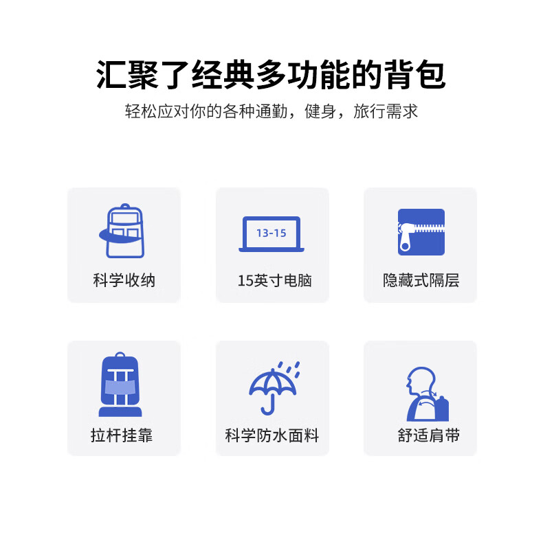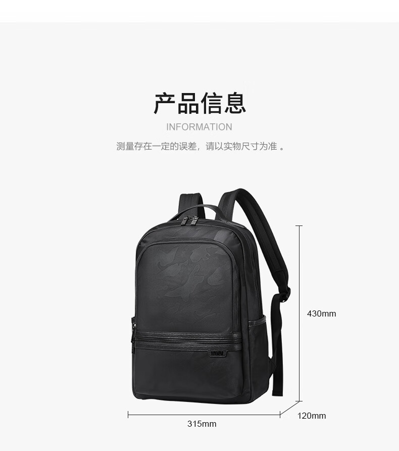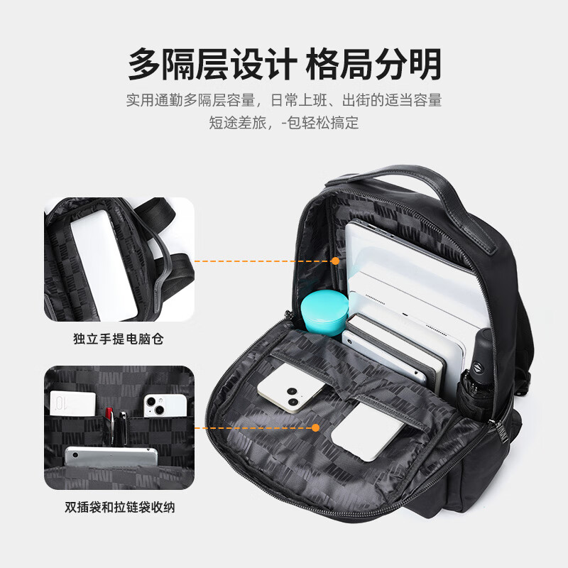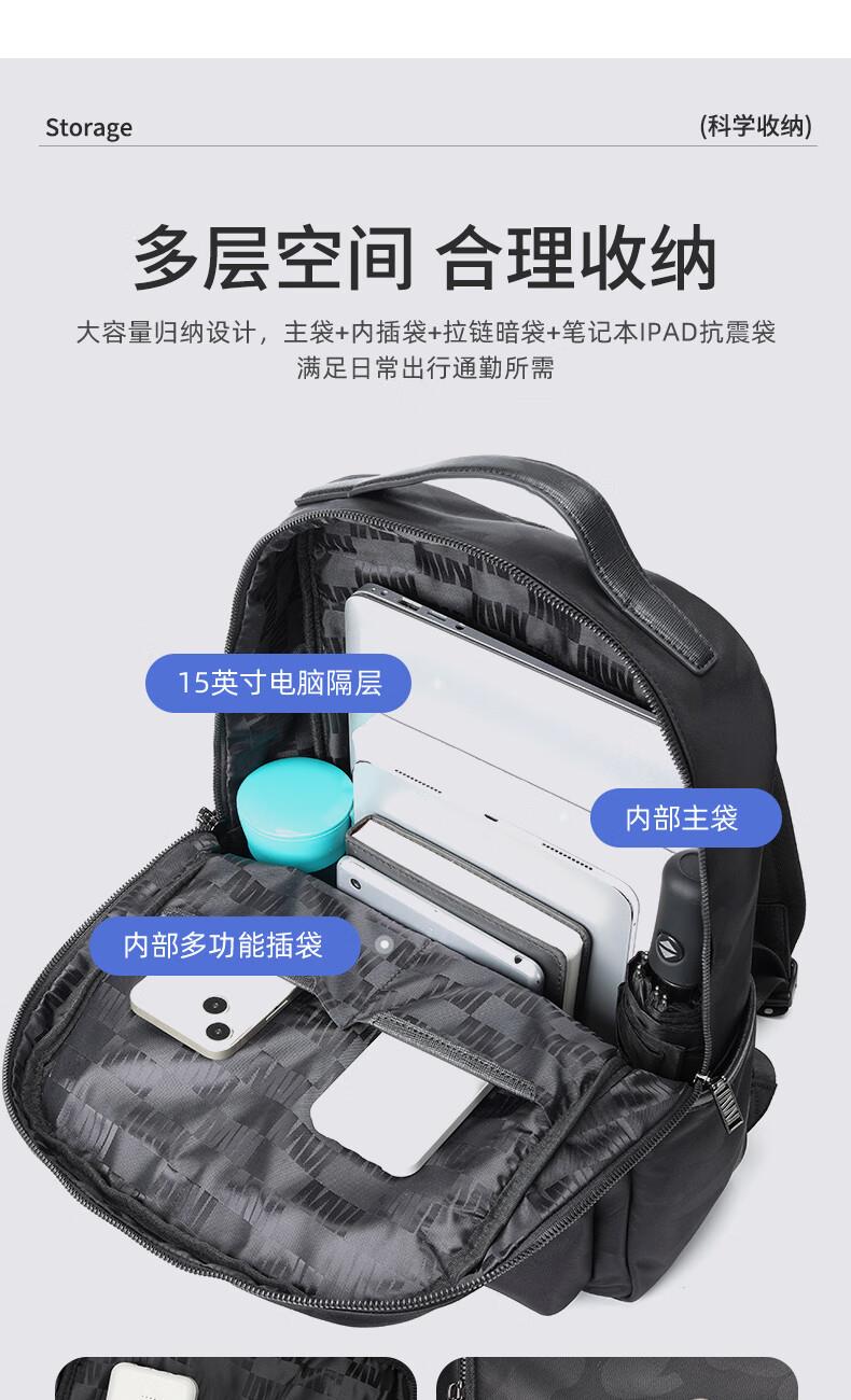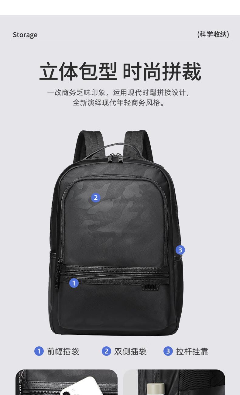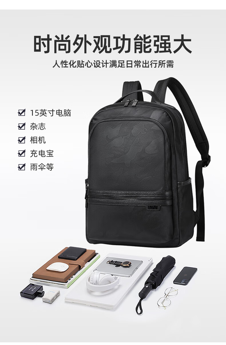 類別:背包 外部材質(zhì):織物 閉合方式:翻蓋式 規(guī)格:300x140x430mm 容納電腦尺寸:15英寸 風(fēng)格:潮流風(fēng) 街頭風(fēng) 攜包出行,旅途無憂,立體挺括包型兼顧時(shí)尚外觀與功能性,輕松駕馭多種都市出行場景 內(nèi)里大容裝載,多層收納空間,滿足多樣收納需求,輕裝出行,采用高密度織物面料,防刮耐用,防潑賤,輕松應(yīng)對(duì)潑水