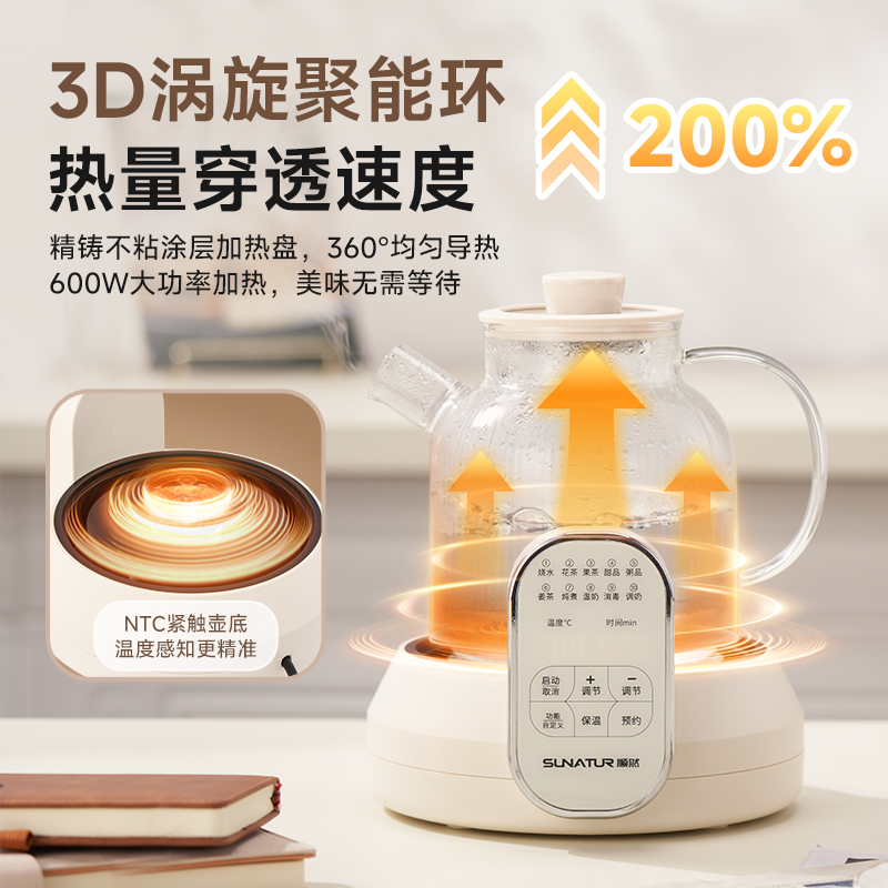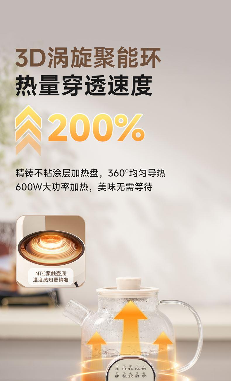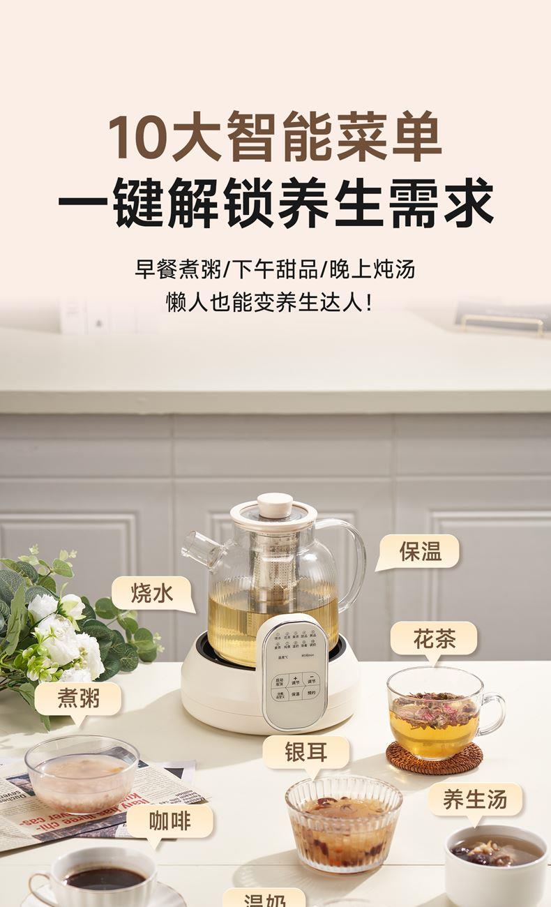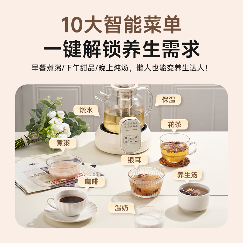 1.2L大容量,高硼硅玻璃壺體,無縫一體式密封設計 600W 功率發(fā)熱技術; 分體式結構,搭配玻璃燉盅和不銹鋼濾網,滿足燉煮、過濾等多樣需求; 10大智能菜單加持,支持全自動燉煮、恒溫保溫,適配花茶、養(yǎng)生湯等多種場景;