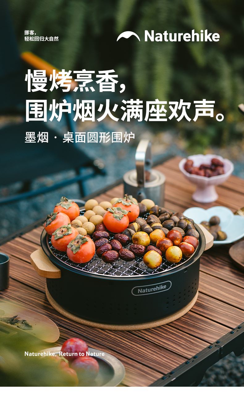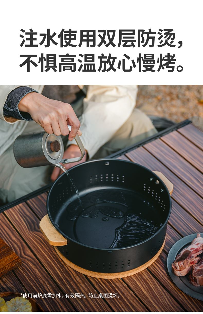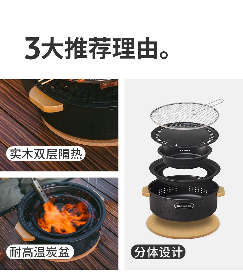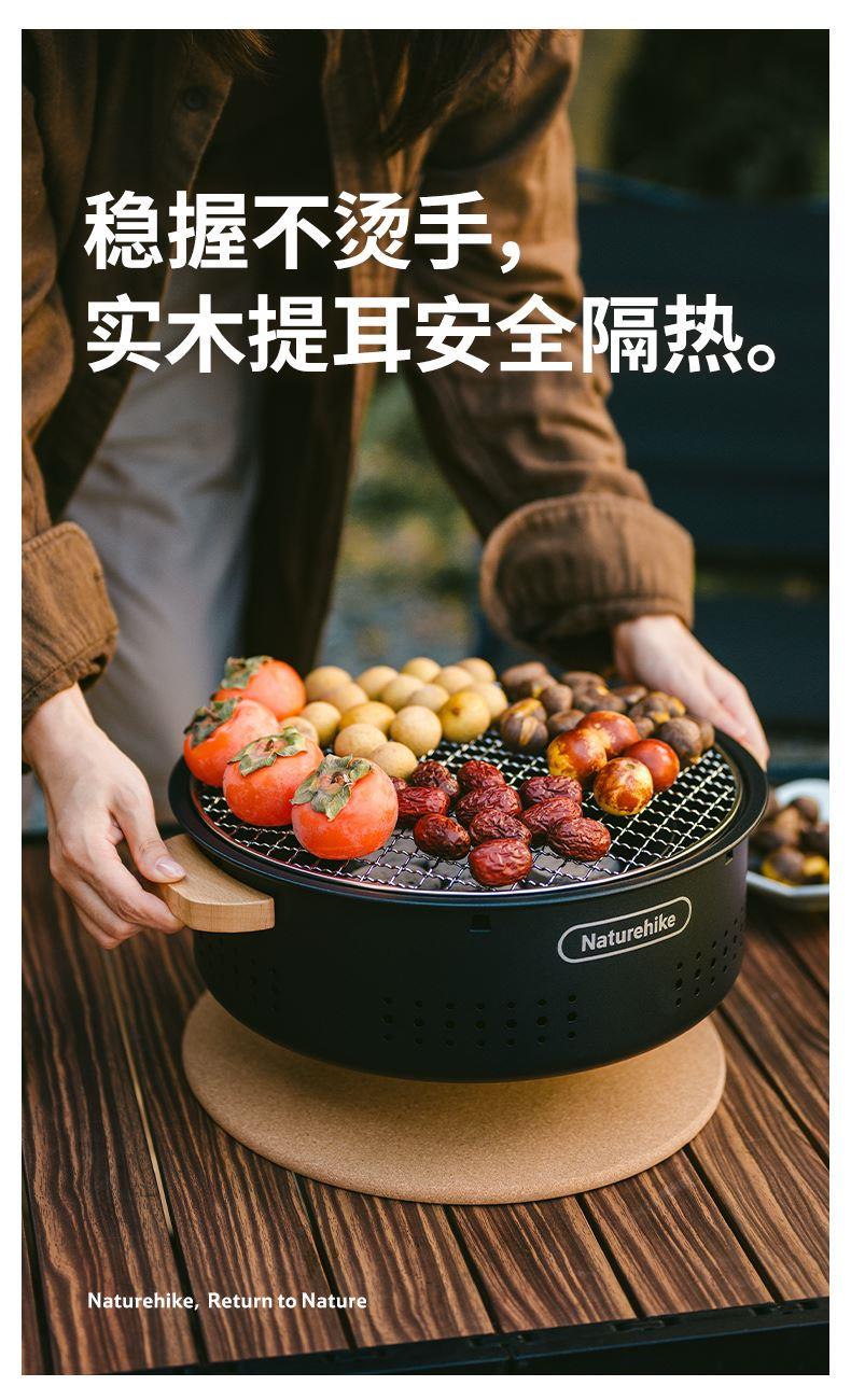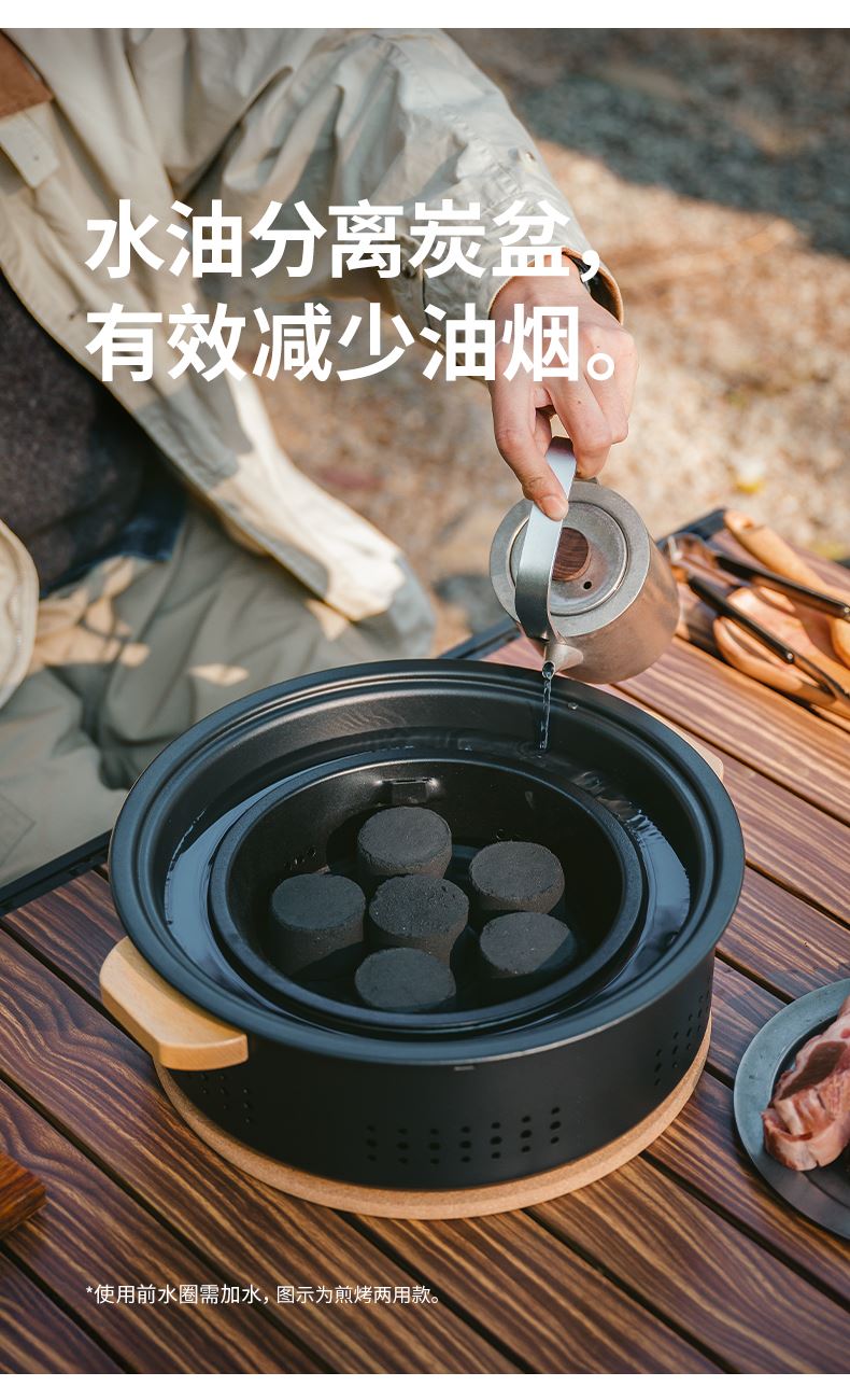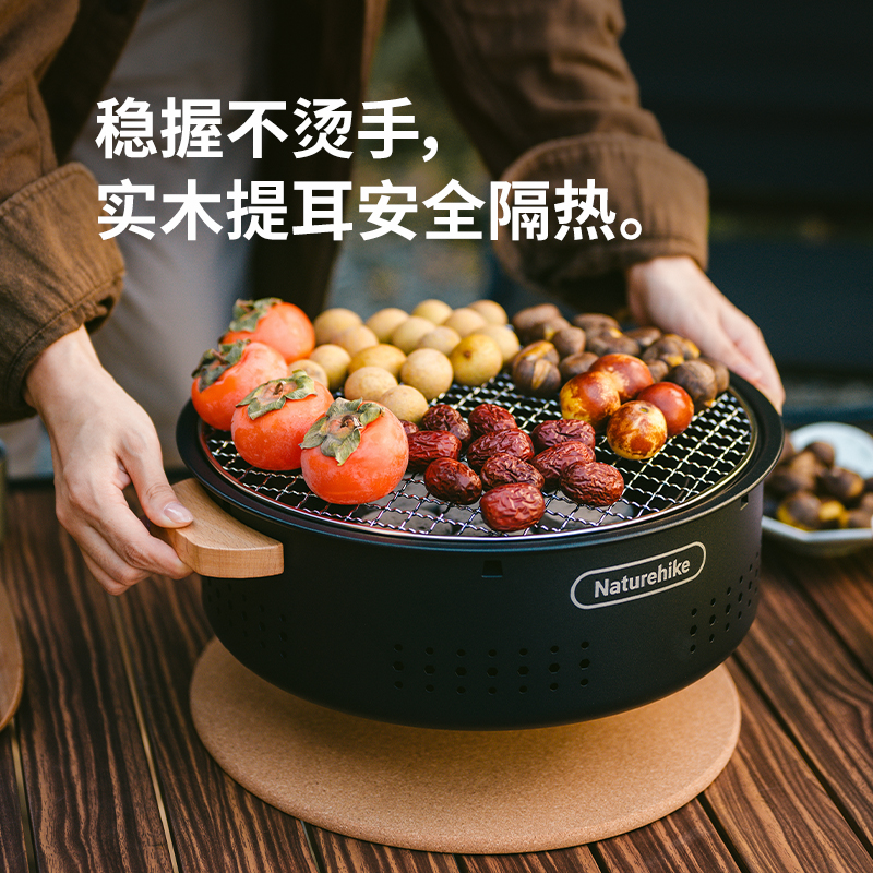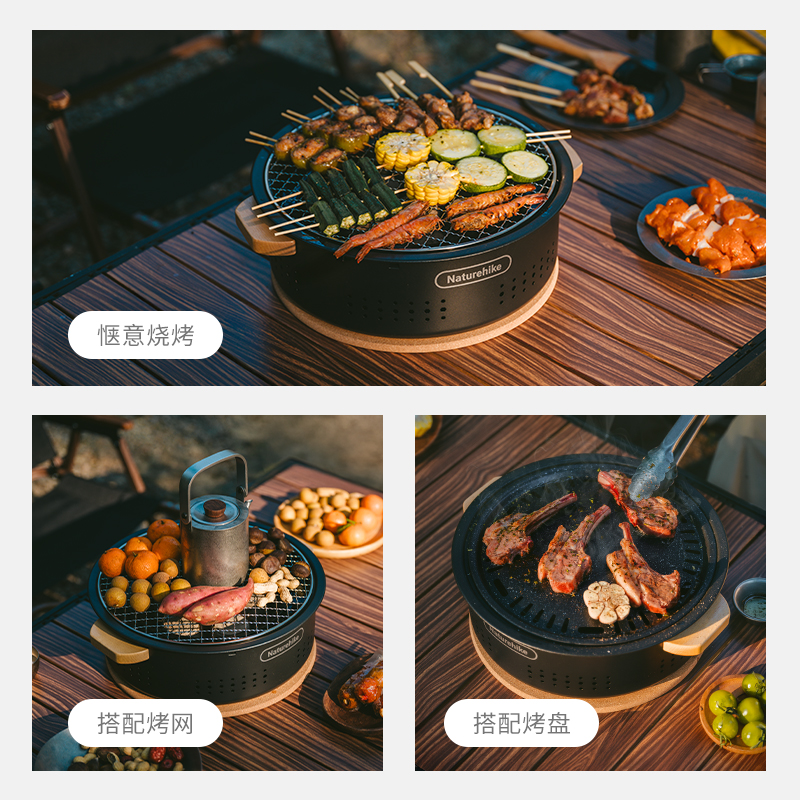 Naturehike CNK2550CF010 墨煙桌面圓形圍爐 尺寸:36*32.6*13cm 重量:約2.3kg 顏色:黑色 材質(zhì):冷軋板,鐵鍍鉻,櫸木,軟木 產(chǎn)品特點(diǎn): 穩(wěn)握不燙手實(shí)木提耳安全隔熱 水油分離炭盆有效減少油煙 食品級(jí)烤網(wǎng)耐用抗銹易清潔 分體式設(shè)計(jì),拆卸友好易清洗 600°耐高溫炭盆,穩(wěn)定承熱才更耐燒 收納簡(jiǎn)單一拎即走
