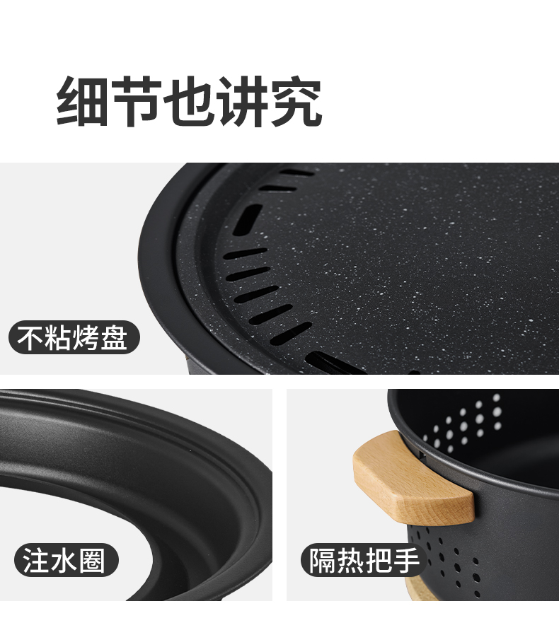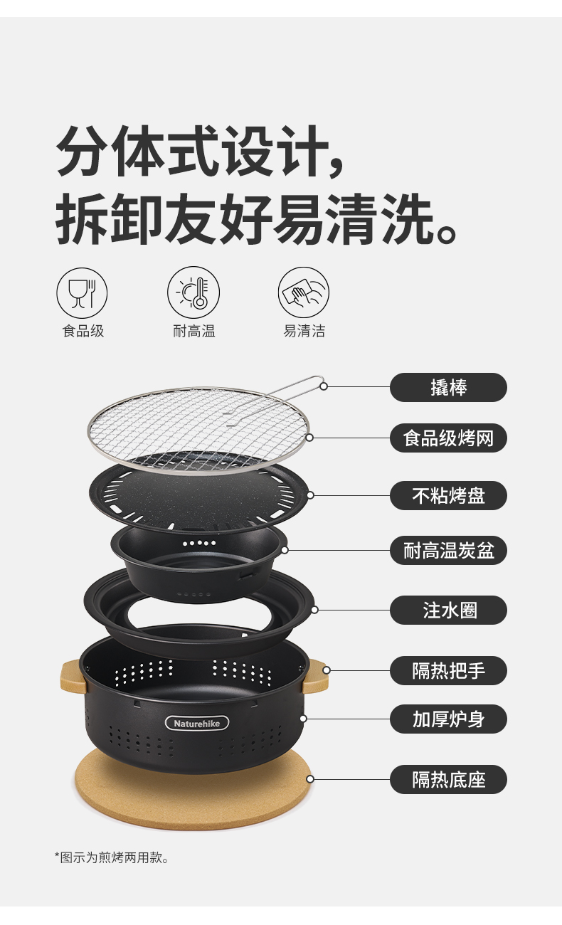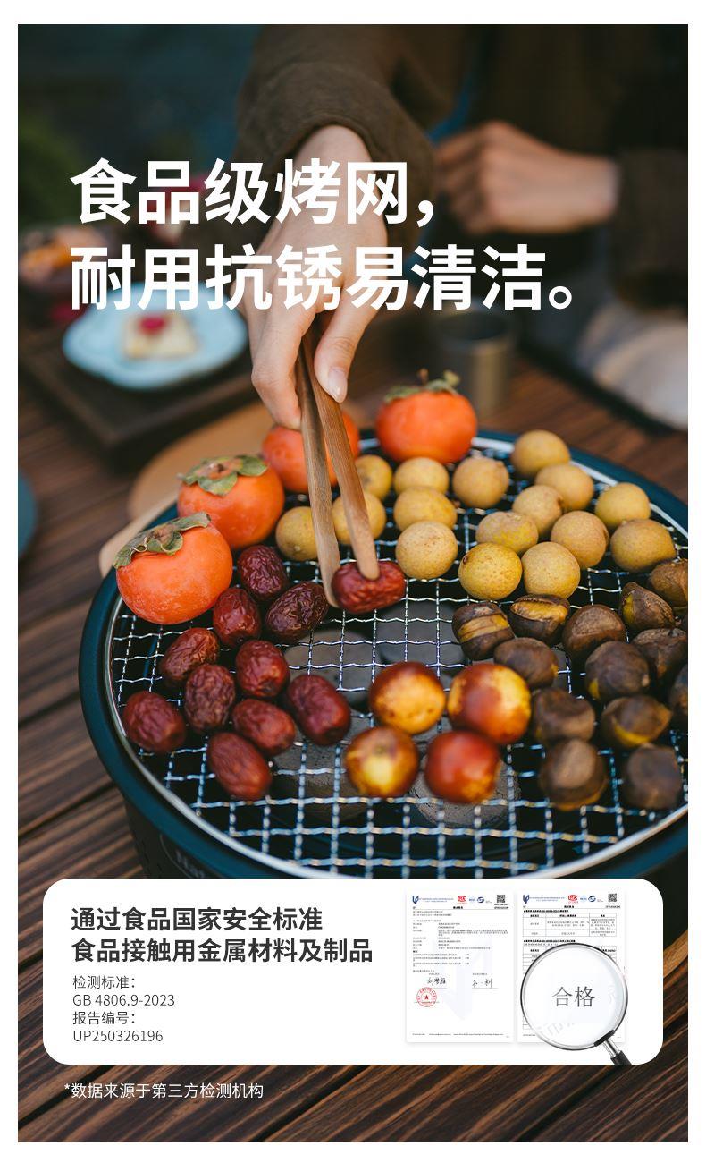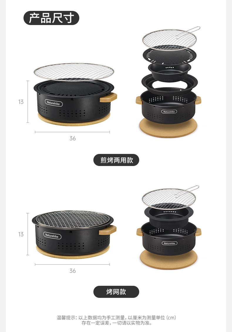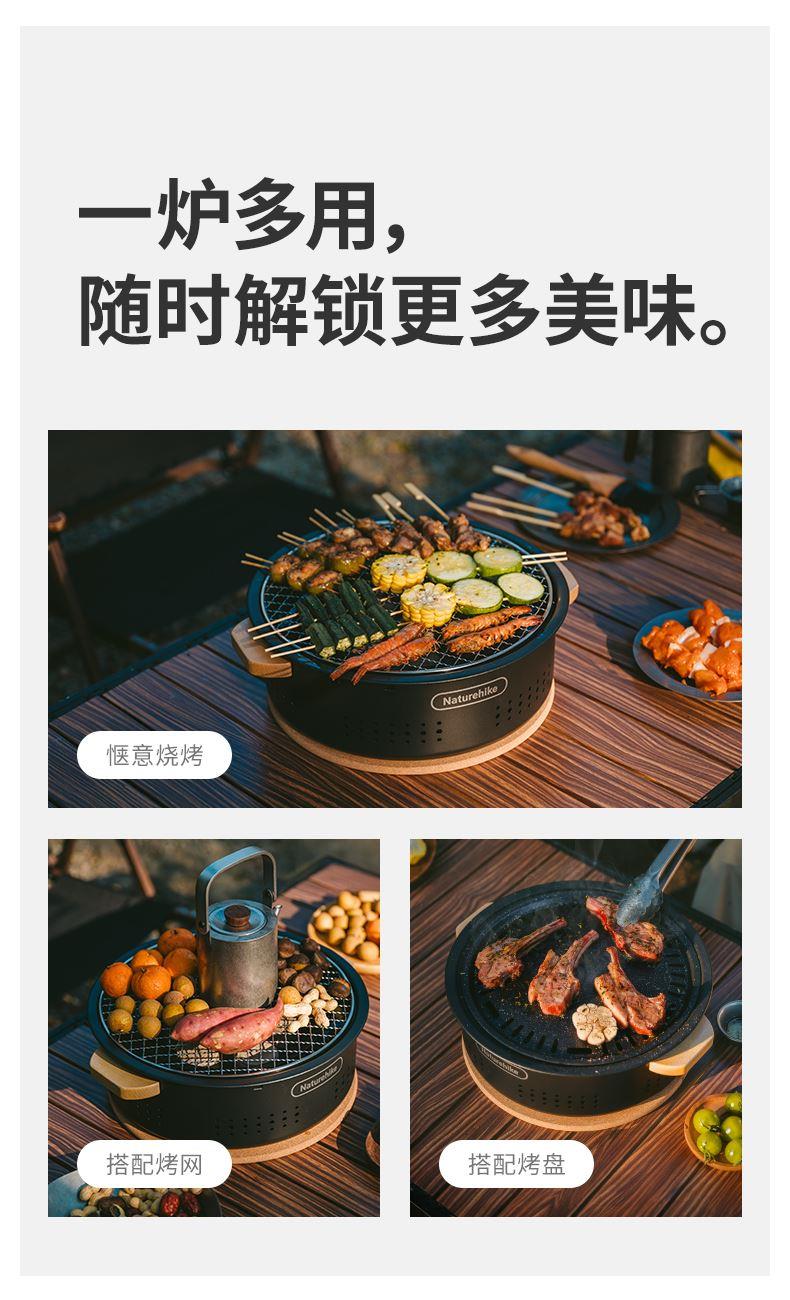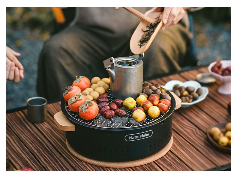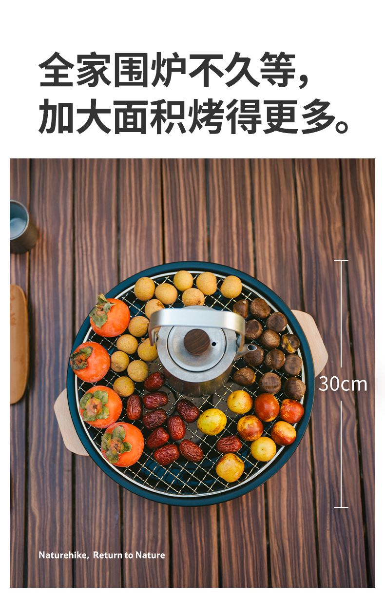 Naturehike CNK2550CF010 墨煙桌面圓形圍爐 尺寸:36*32.6*13cm 重量:約2.3kg 顏色:黑色 材質(zhì):冷軋板,鐵鍍鉻,櫸木,軟木 產(chǎn)品特點(diǎn): 穩(wěn)握不燙手實(shí)木提耳安全隔熱 水油分離炭盆有效減少油煙 食品級(jí)烤網(wǎng)耐用抗銹易清潔 分體式設(shè)計(jì),拆卸友好易清洗 600°耐高溫炭盆,穩(wěn)定承熱才更耐燒 收納簡(jiǎn)單一拎即走
