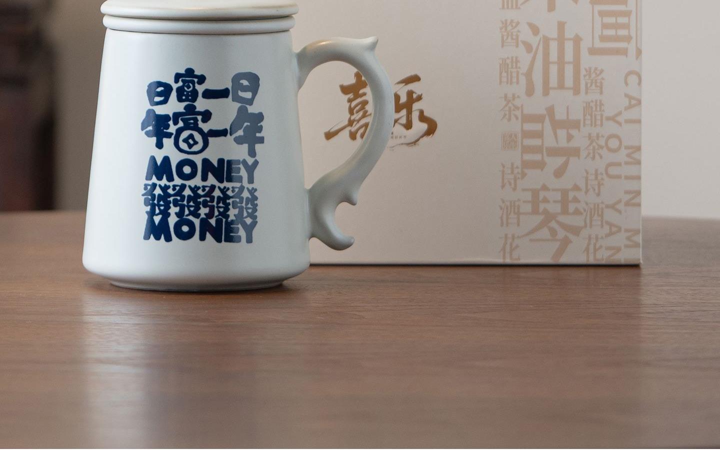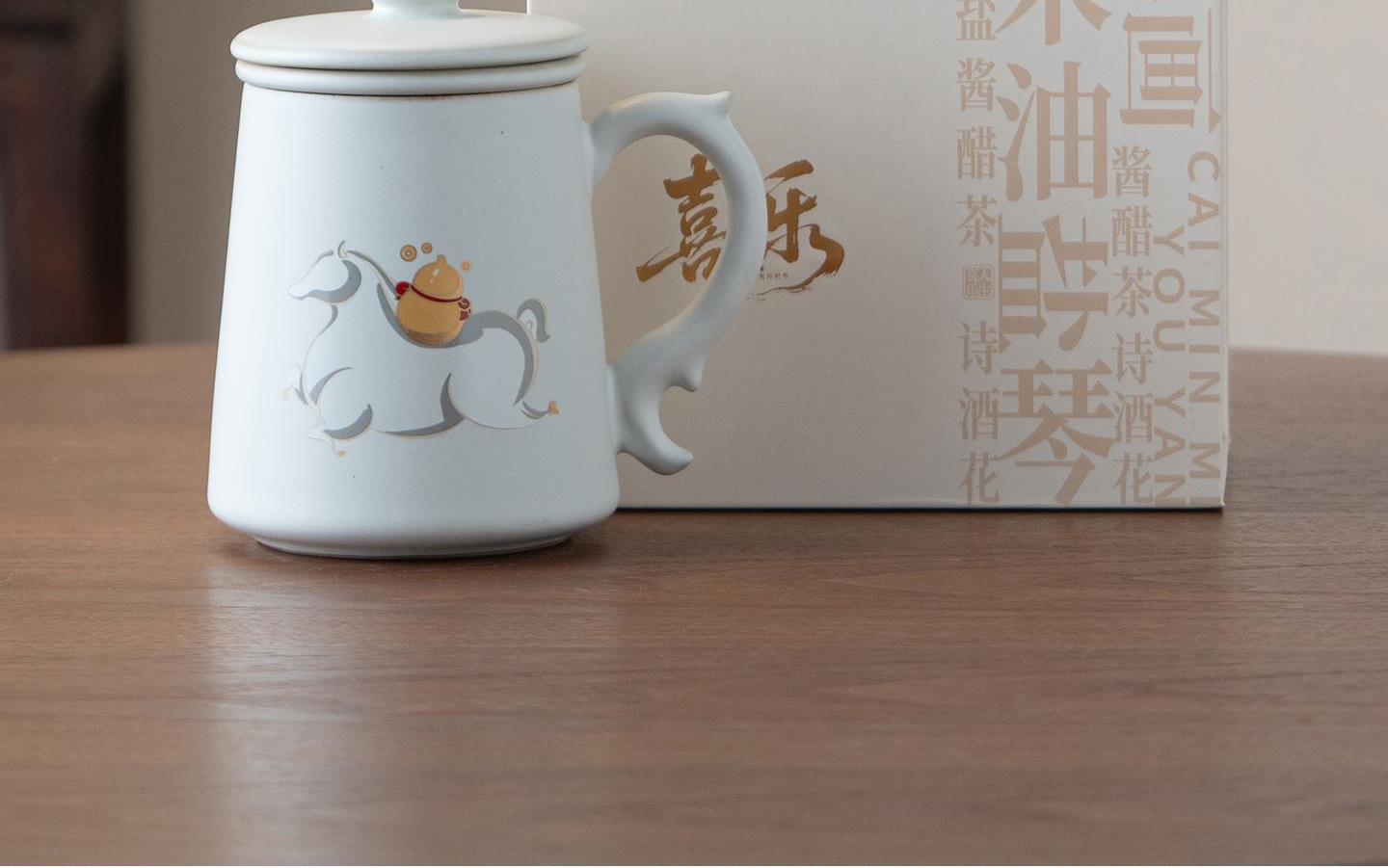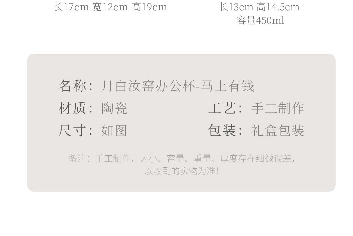 配置:辦公杯*1,禮盒*1. 尺寸:辦公杯長13cm高14.5cm容量450ml, 禮盒:長17cm寬12cm高19cm。 款式:暴富系列/馬上有福系列。