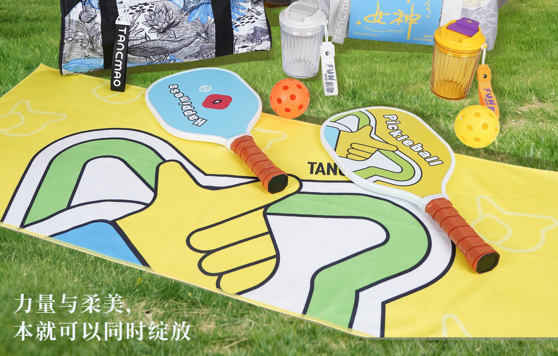 旅行包*1海洋藍/叢林灰440*200*230mm 匹克球拍*1套 正反兩色匹克球*2 運動汗中*1400*1000mm 運動杯*1白/黃 450ml