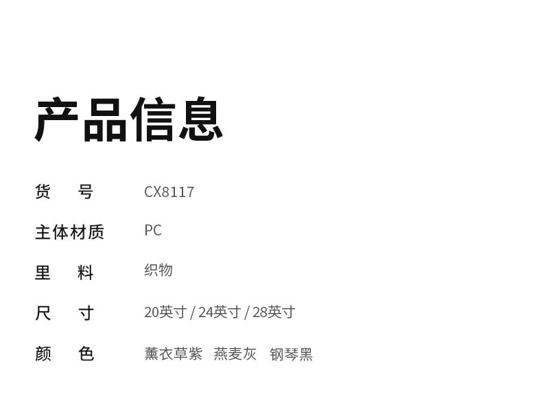 貨號(hào): CX8117-28 主體面料:聚碳酸酯(PC);里料:織物 28寸顏色:玉白色 凈重: 4.90kg/108L